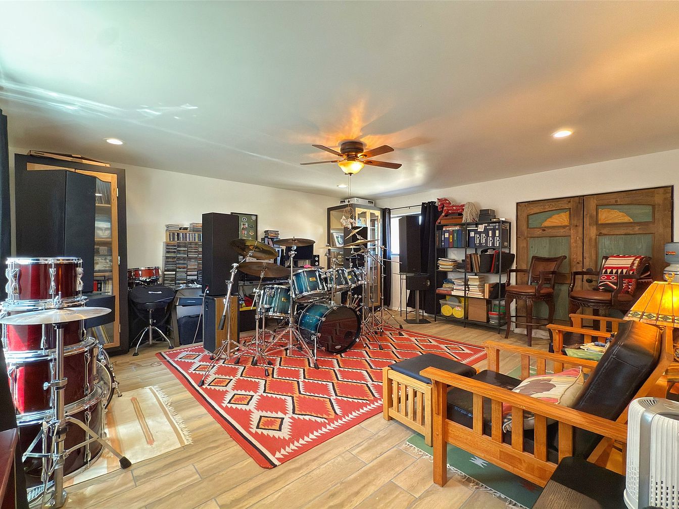 This spacious room is designed as a versatile music studio, featuring a full drum set as the focal point, placed on a vibrant red and white geometric-patterned rug that adds warmth and energy to the space. The flooring is light wood tile, complementing the neutral walls and ceiling. Surrounding the drum kit are speakers, shelves loaded with CDs, books, and various musical equipment, reflecting a blend of functionality and personal interest. Comfortable wood-framed seating with cushions and a warm-toned table lamp create a cozy ambiance, while a ceiling fan offers practical lighting and ventilation. Rustic double doors and black curtains add character and contrast to the otherwise bright, inviting room.