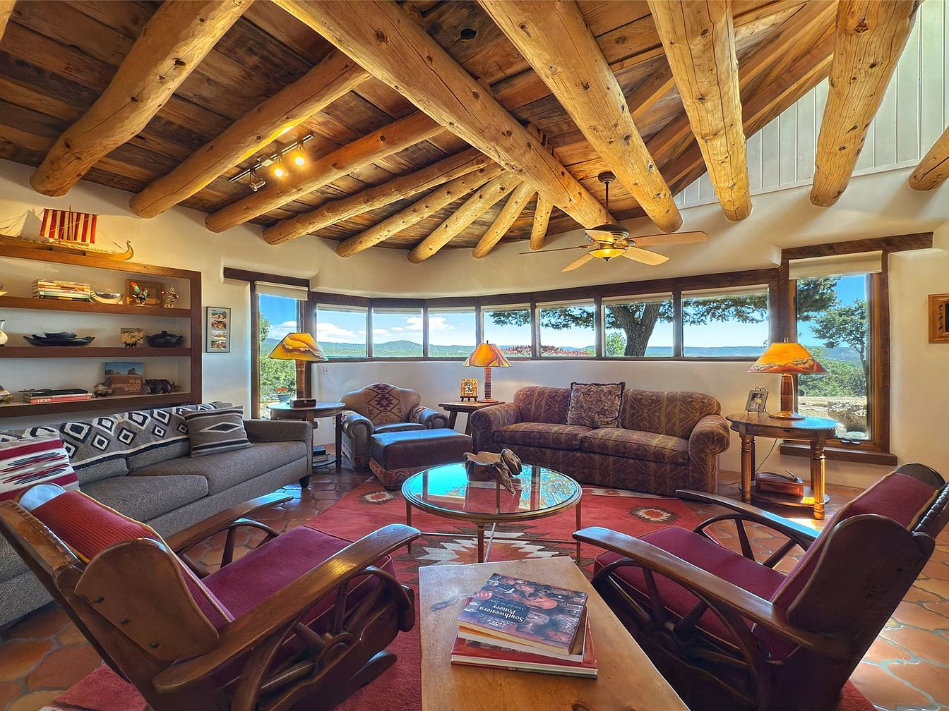 This inviting living room features a stunning exposed wooden beam ceiling that adds rustic charm and warmth. The space is arranged around a circular layout, centered on a round glass coffee table sitting atop a vibrant southwestern-patterned red area rug. Comfortable seating includes a large gray sofa, a patterned plush sofa, and two wooden framed chairs upholstered in rich red fabric. Natural light floods the room through a curved row of windows, offering panoramic views of the outdoors. Warm wood tones, earthy hues, and cozy textiles blend perfectly with southwestern décor accents and soft table lamps creating an intimate and welcoming atmosphere.
