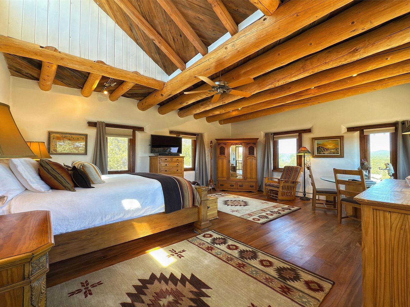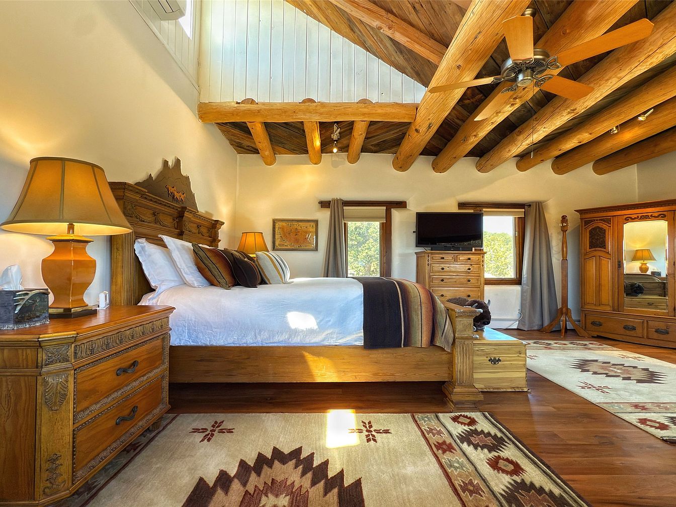 This spacious bedroom melds rustic and traditional design, featuring a warm wooden bed frame with intricately carved headboard and matching bedside furniture. The high ceiling showcases exposed timber beams, adding architectural interest and a cozy cabin feel. Neutral walls complement the rich wood tones, while the patterned rugs bring a Southwestern flair with earthy reds, browns, and beiges. Soft lighting from large amber lamps enhances the inviting atmosphere. Two windows framed by simple curtains offer natural light and views, balanced by a wooden dresser and armoire for ample storage and understated elegance.