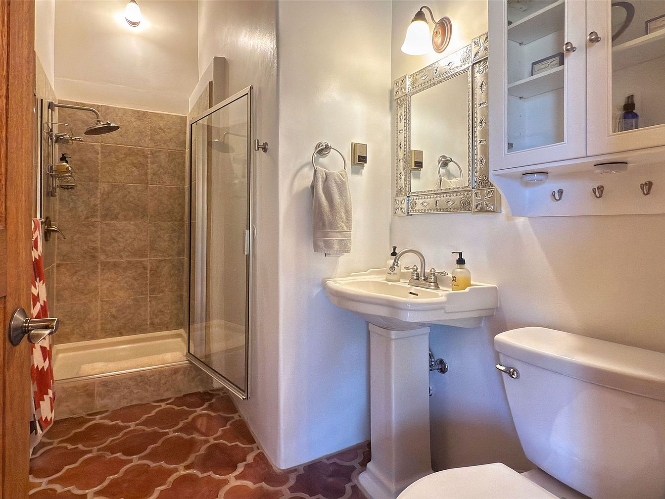 This bathroom presents a harmonious blend of classic and rustic elements. The focal point includes a white pedestal sink topped with a detailed, ornamental mirror framed in silver, which adds a touch of elegance. Adjacent white cabinetry provides practical storage with a combination of glass and solid doors, while hooks beneath offer convenience. The walk-in shower features earth-toned tiles with a glass enclosure, complementing the terracotta-patterned floor tiles that bring warmth and character. Soft white walls and matching fixtures create a clean, inviting space with subtle vintage charm.