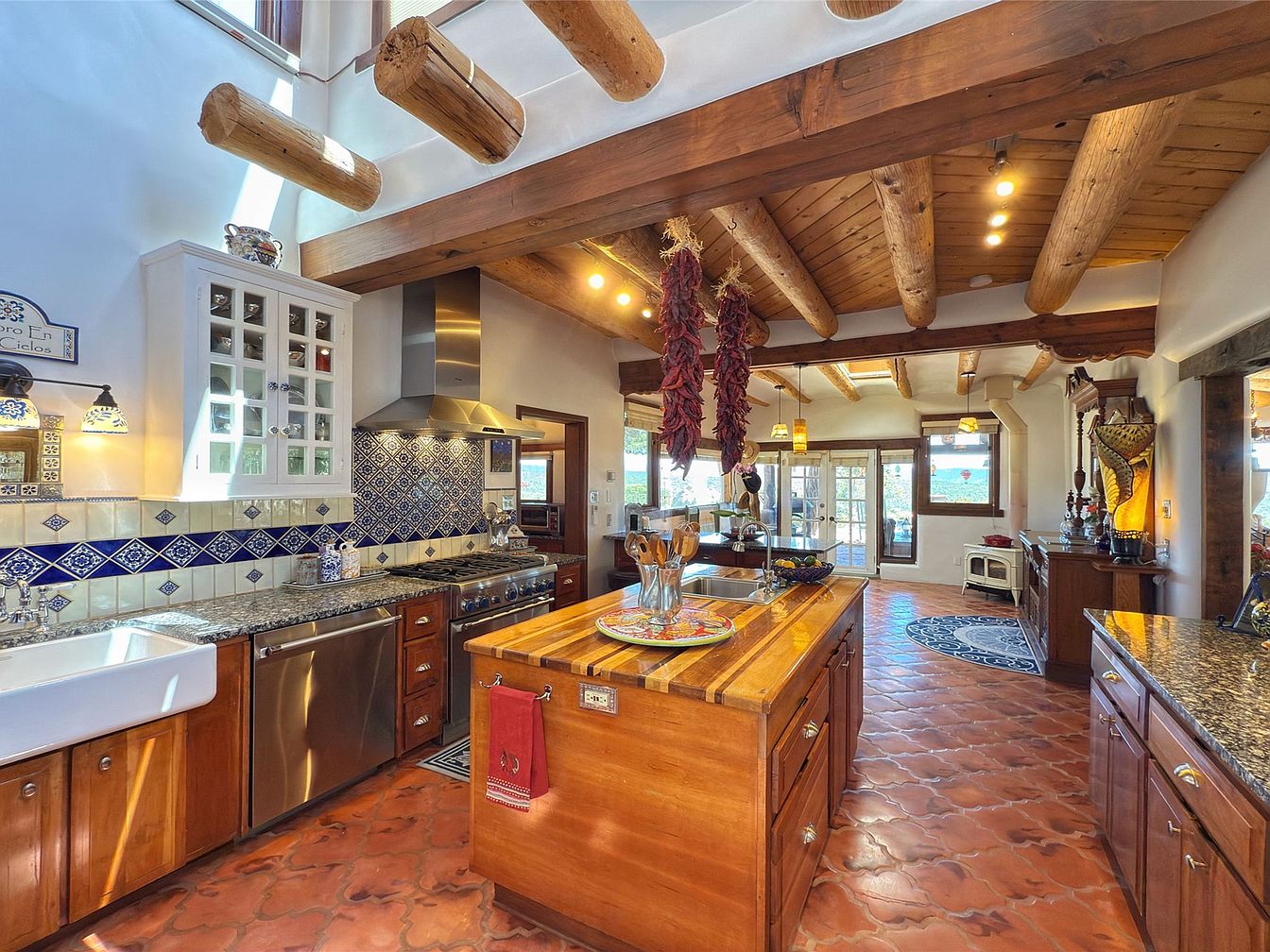 This spacious kitchen features warm terracotta tile floors paired with exposed wooden ceiling beams and a wood-paneled ceiling, exuding a rustic Southwestern charm. Rich wooden cabinetry with bronze hardware complements the polished granite countertops and stainless steel appliances, including a dishwasher and a large range hood. The colorful tile backsplash showcases intricate blue and cream patterns that add vibrance and handcrafted appeal. A central island with a wooden butcher-block countertop provides additional workspace, accented by hanging dried chili peppers that evoke regional character. Ample natural light filters through large windows, enhancing the cozy, inviting atmosphere.