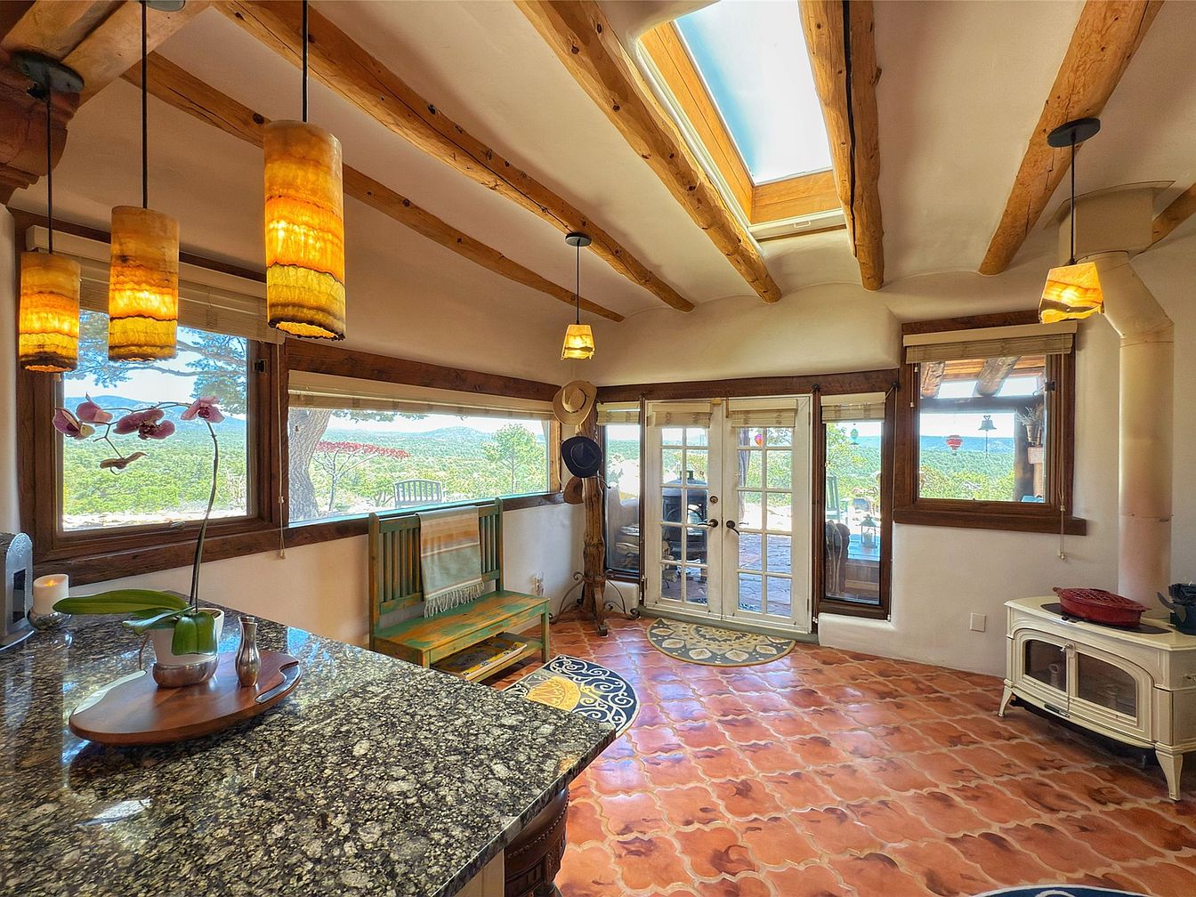This cozy breakfast nook features warm terracotta tile flooring with intricate circular patterned rugs adding a charming touch. Rustic wooden ceiling beams contrast with smooth white walls, highlighting a skylight that floods the space with natural light. Multiple large windows framed in rich wood offer expansive views of lush greenery and distant hills, enhancing the room’s connection to nature. A green wooden bench with a throw blanket provides seating, while a sleek granite countertop edge suggests proximity to the kitchen. Soft amber pendant lights hang from the ceiling, creating an inviting ambiance. French doors open out to a covered patio, perfect for indoor-outdoor living, complemented by a white wood-burning stove for warmth and comfort.