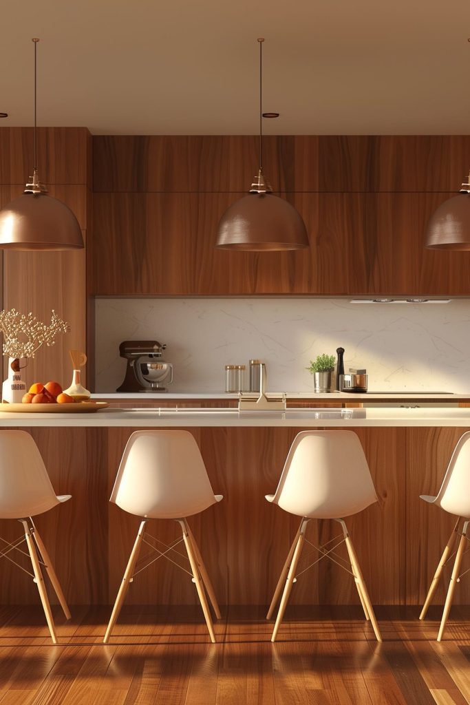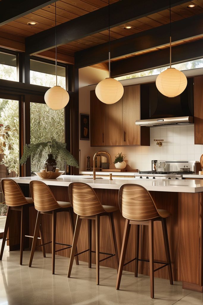 Choose iconic Mid-Century Modern seating options such as Eames chairs or barstools with molded plywood or molded plastic seats, providing comfort and style at your kitchen island or dining area.