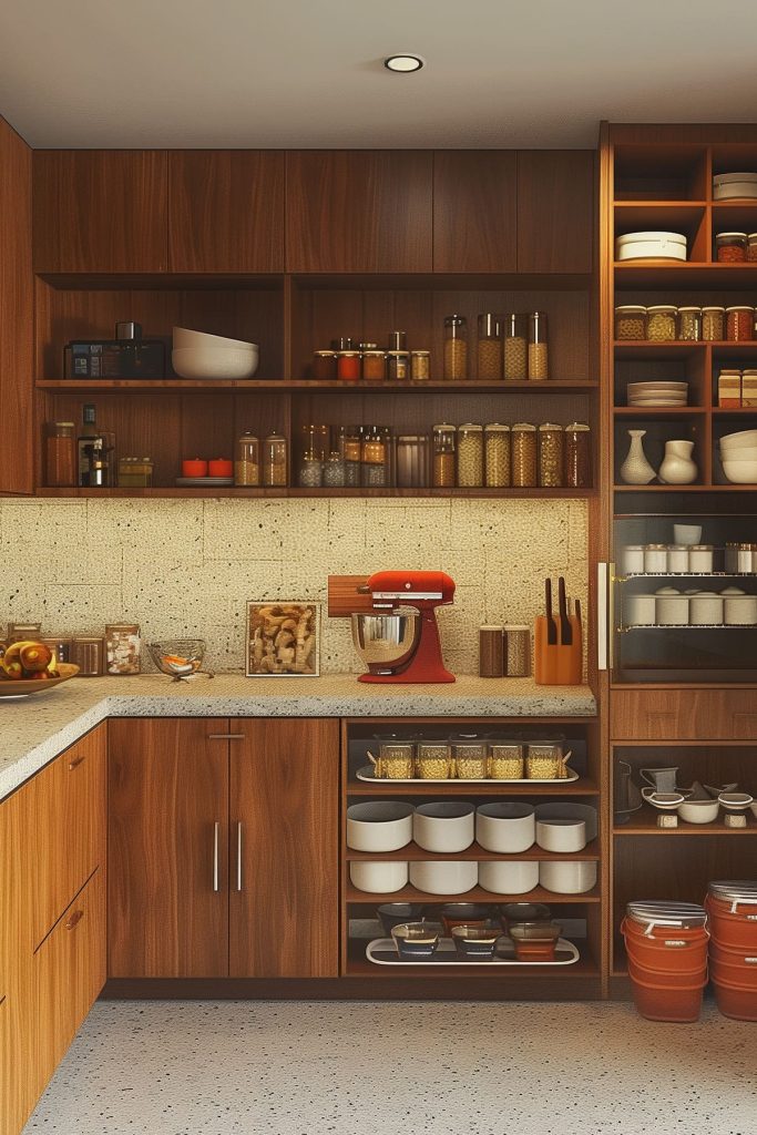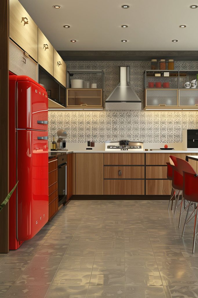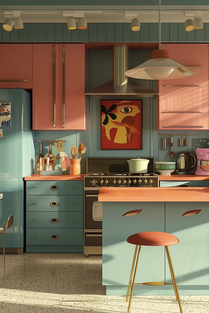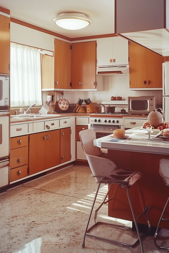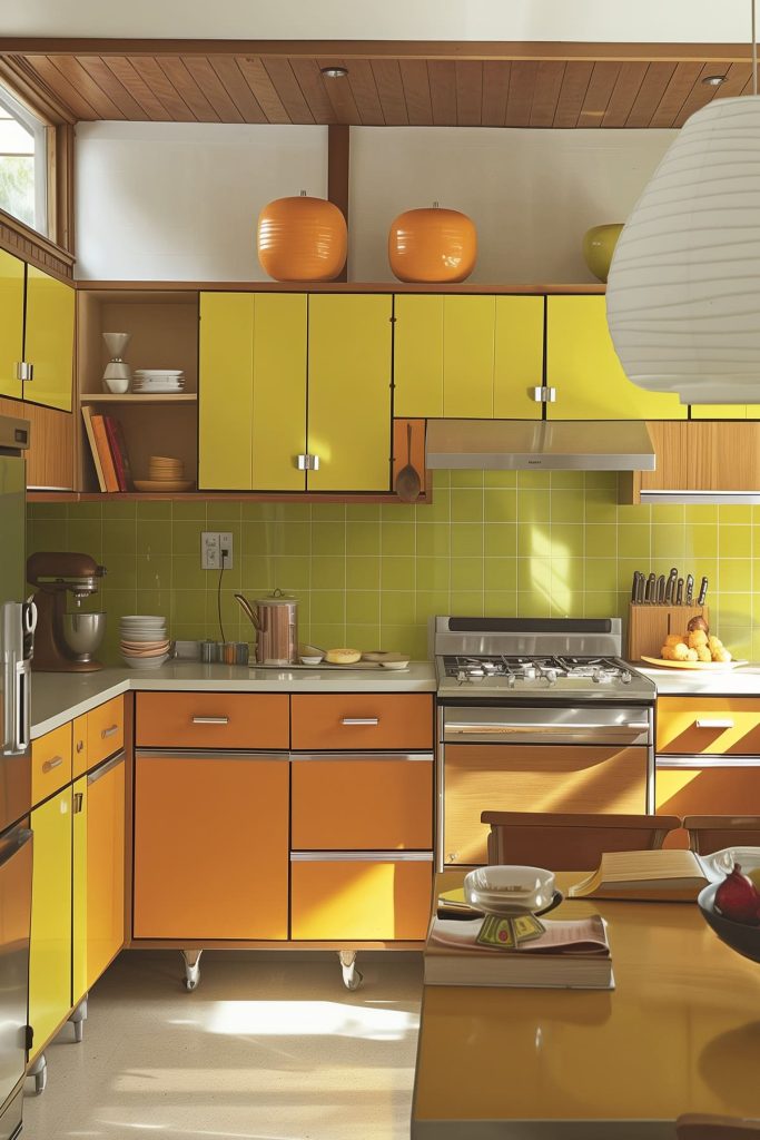 Infuse your kitchen with pops of vibrant colors like mustard yellow, avocado green, or burnt orange, reminiscent of the bold hues popular during the Mid-Century era.