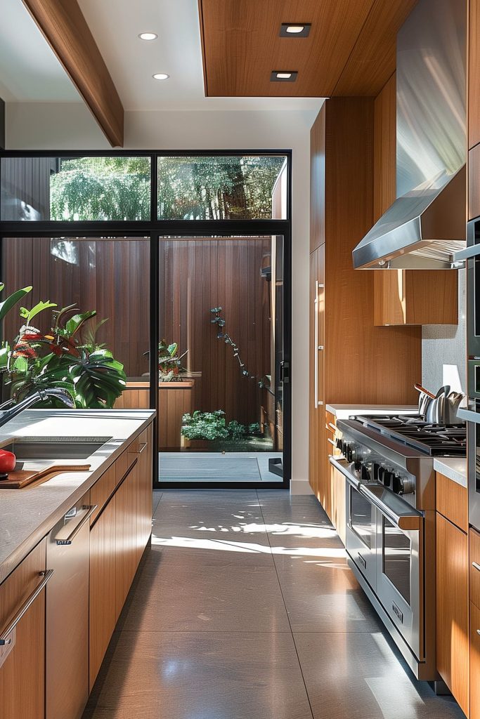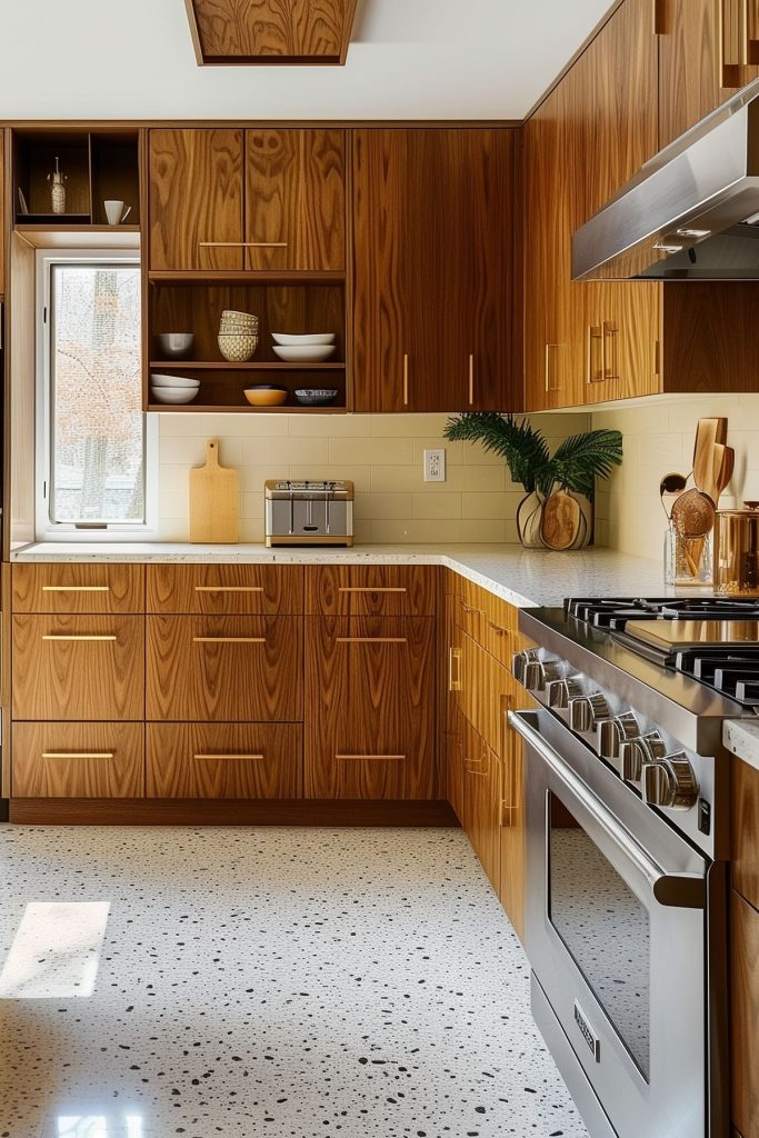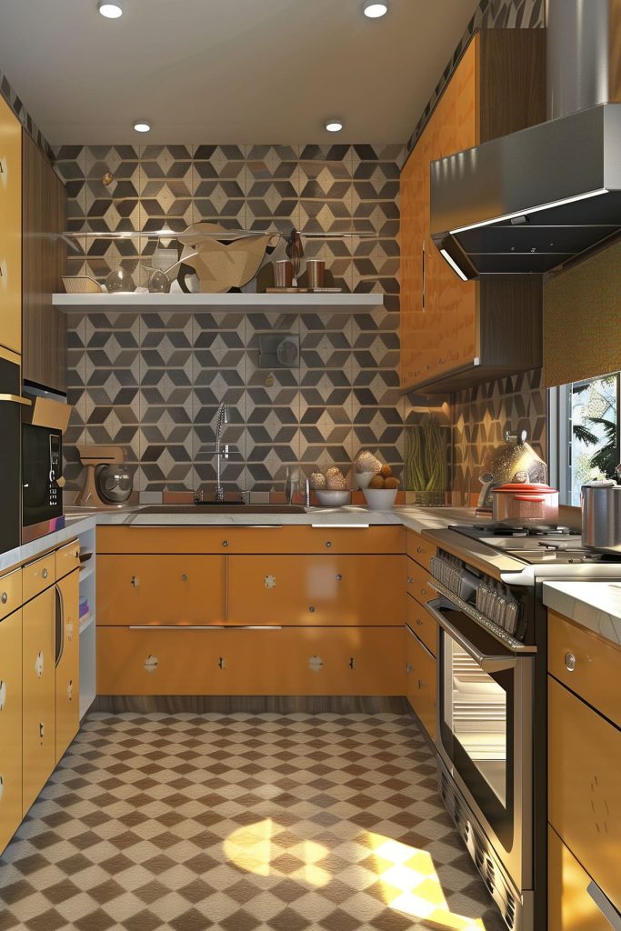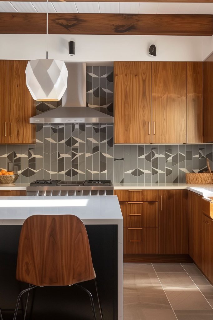 Choose linear or geometric tile patterns for backsplashes or flooring, adding visual interest and enhancing the Mid-Century Modern aesthetic of your kitchen.