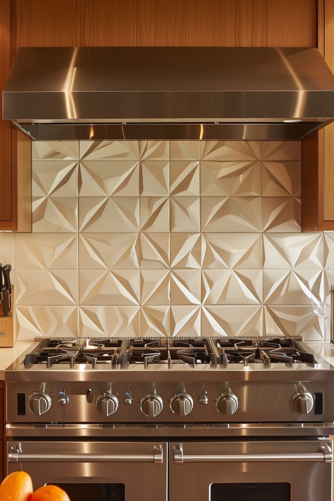 Install a textured backsplash in ceramic or glass tiles with geometric or abstract patterns, adding tactile appeal and visual intrigue to your kitchen’s design.