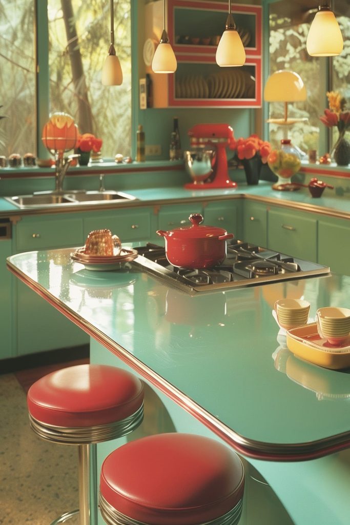Opt for durable and easy-to-clean Formica countertops in retro colors like aqua, red, or boomerang patterns, evoking nostalgia for the 1950s and 1960s.
