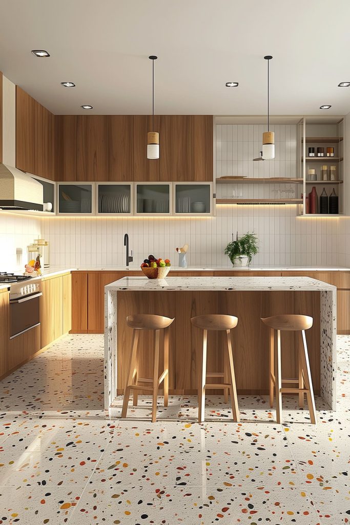 Incorporate terrazzo flooring with flecks of colorful aggregates for a retro-inspired yet contemporary flooring option that’s durable, low-maintenance, and visually captivating.