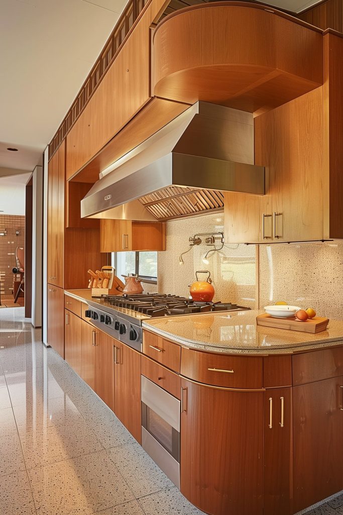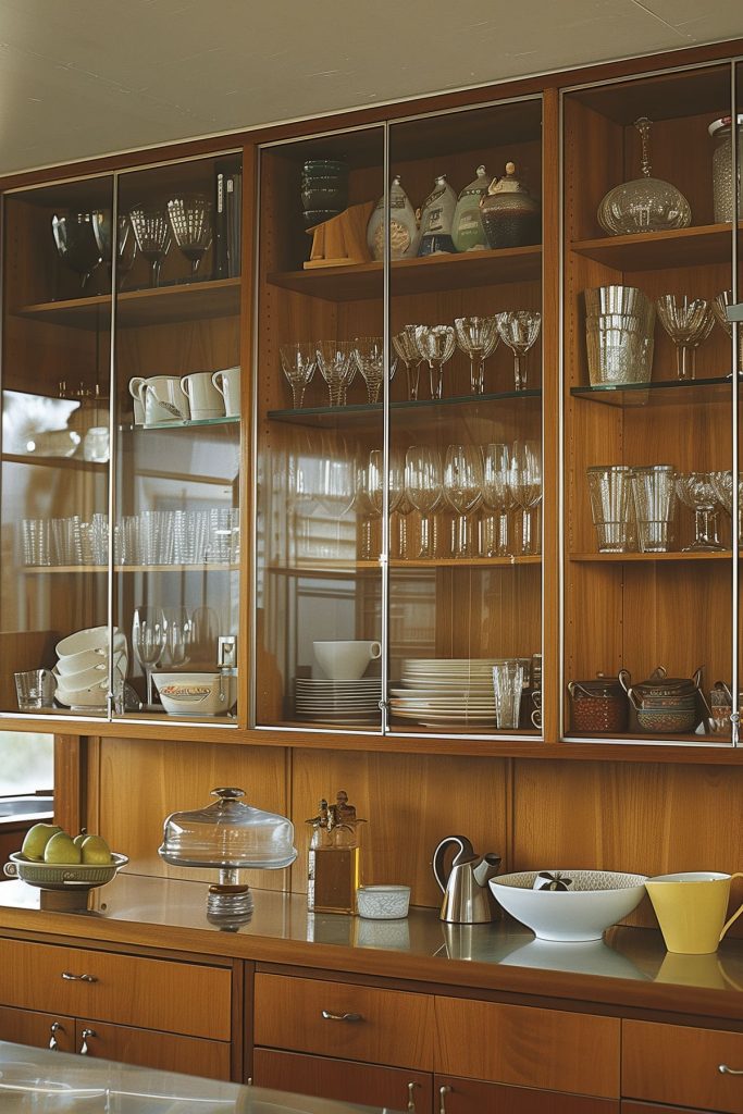 Combine a variety of materials such as wood, metal, glass, and laminate to create visual interest and texture in your kitchen design, reflecting the eclectic spirit of Mid-Century Modernism.