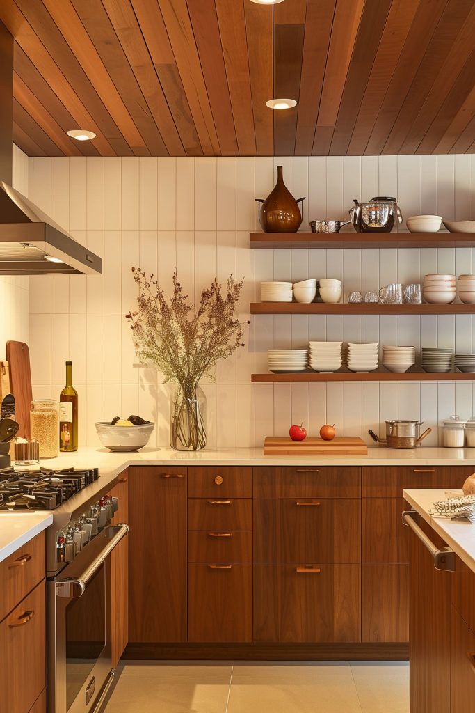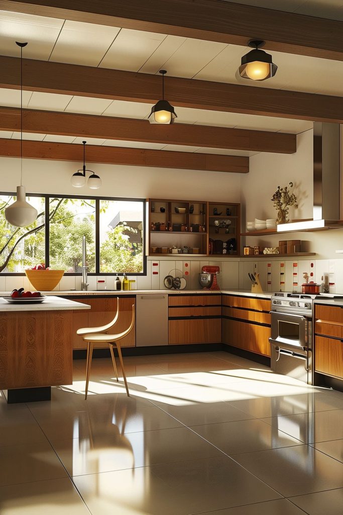 Highlight architectural details with exposed ceiling beams in natural wood or painted finishes, adding visual interest and depth to your Mid-Century Modern kitchen.