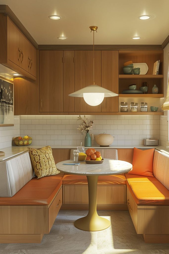 Incorporate built-in dining nooks or banquettes with upholstered seating and mid-century-inspired tables for a cozy and inviting gathering space within your kitchen.