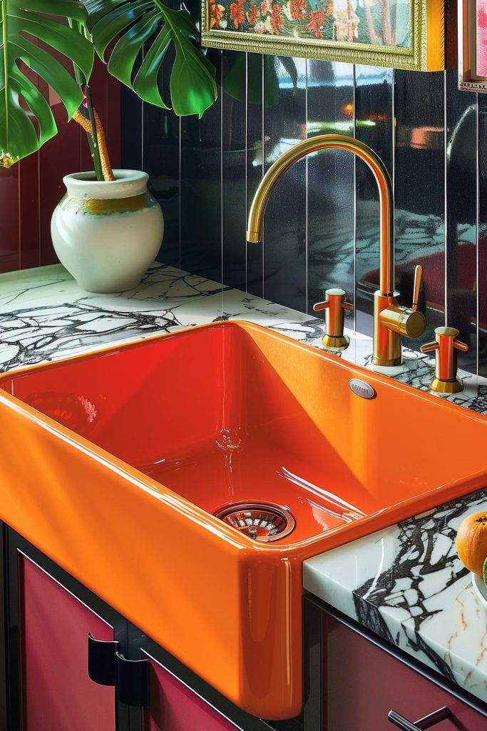 Install a statement sink in a bold color or unique shape, such as a rectangular or rounded vessel sink in vibrant hues, serving as a focal point in your kitchen’s design.