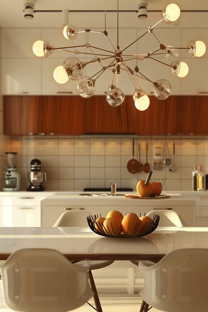 Make a statement with a Sputnik chandelier or pendant light fixture, featuring a futuristic design with multiple arms and globe-shaped bulbs, adding drama and sophistication to your kitchen.