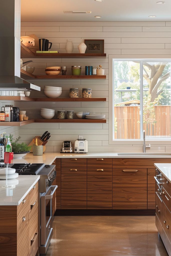 Install floating shelves in wood or metal finishes for displaying decorative objects, glassware, and kitchen essentials while maintaining an open and airy feel in your kitchen.