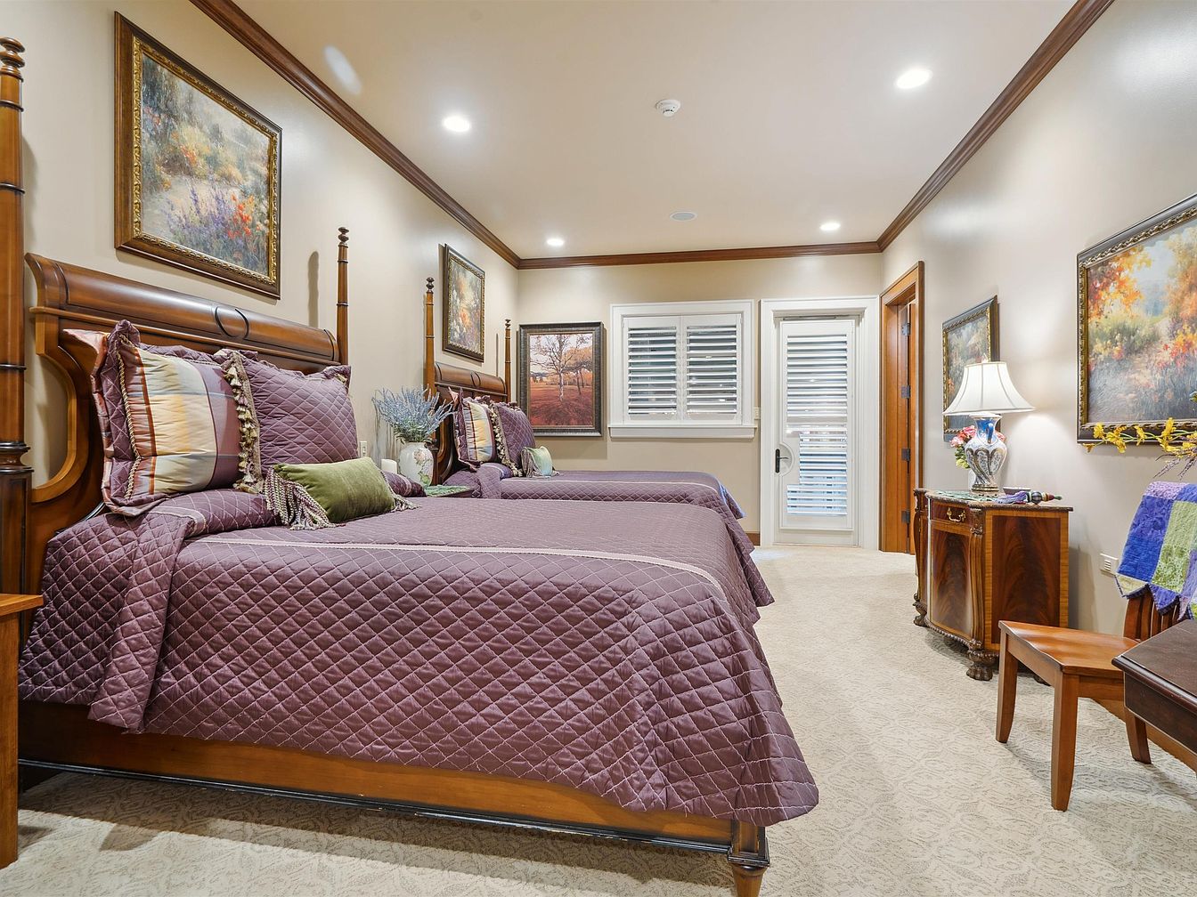 This bedroom features two twin beds with matching wooden headboards and footboards, dressed in quilted plum-purple bedspreads with a diamond pattern. The walls are painted a soft beige tone, complemented by rich brown crown molding that frames the ceiling and adds an elegant touch. The carpet is light tan with a subtle pattern, enhancing the warm ambiance. Framed landscape paintings adorn the walls, contributing a classic, serene vibe. Natural light filters through white plantation shutters on a window and glass door at the far end, which lead out to an exterior space. A vintage wooden side table with a decorative lamp sits opposite the beds, alongside a wooden chair draped with a colorful quilt, accentuating the traditional aesthetic.