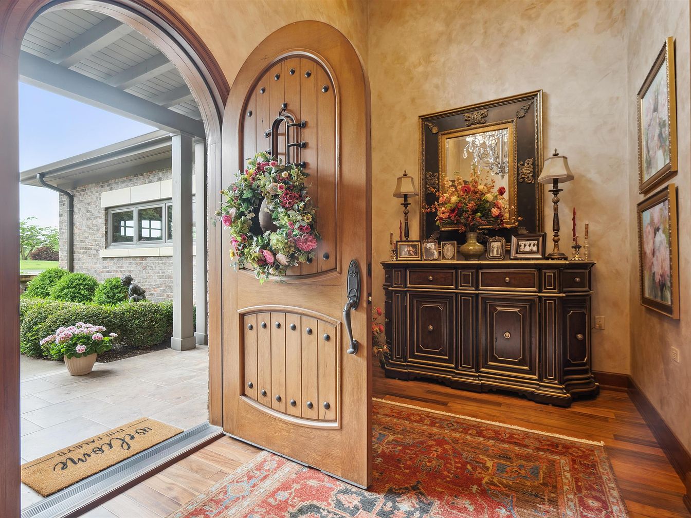 The focal point of this inviting entryway is a large, arched wooden door adorned with a vibrant floral wreath, exuding warmth and charm. The door opens to reveal a space with richly textured walls in a warm beige tone, complementing the polished hardwood floors and an intricately patterned area rug. A traditional dark wood sideboard with gold accents anchors the space, topped with a large, ornate mirror and floral arrangement. Coordinated candlesticks and framed family photos add a personal touch, while framed floral paintings on the adjacent wall enhance the elegant, welcoming atmosphere of this transition from outdoor to indoor.