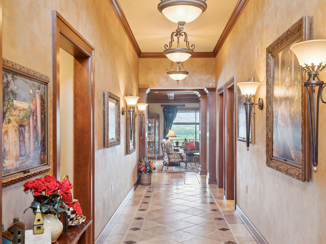 This warm hallway features a textured beige wall finish complemented by rich wooden trim and door frames. The tiled floor showcases a diamond pattern with darker accent tiles, adding subtle visual interest. Elegant light fixtures, including ceiling pendants and ornate wall sconces, provide a soft, inviting glow. The walls are adorned with framed paintings contributing to a classic, refined aesthetic. At the end of the hall, a glimpse into a cozy living area is visible, characterized by comfortable upholstered chairs, layered window treatments, and an abundance of natural light streaming through large windows overlooking greenery beyond.