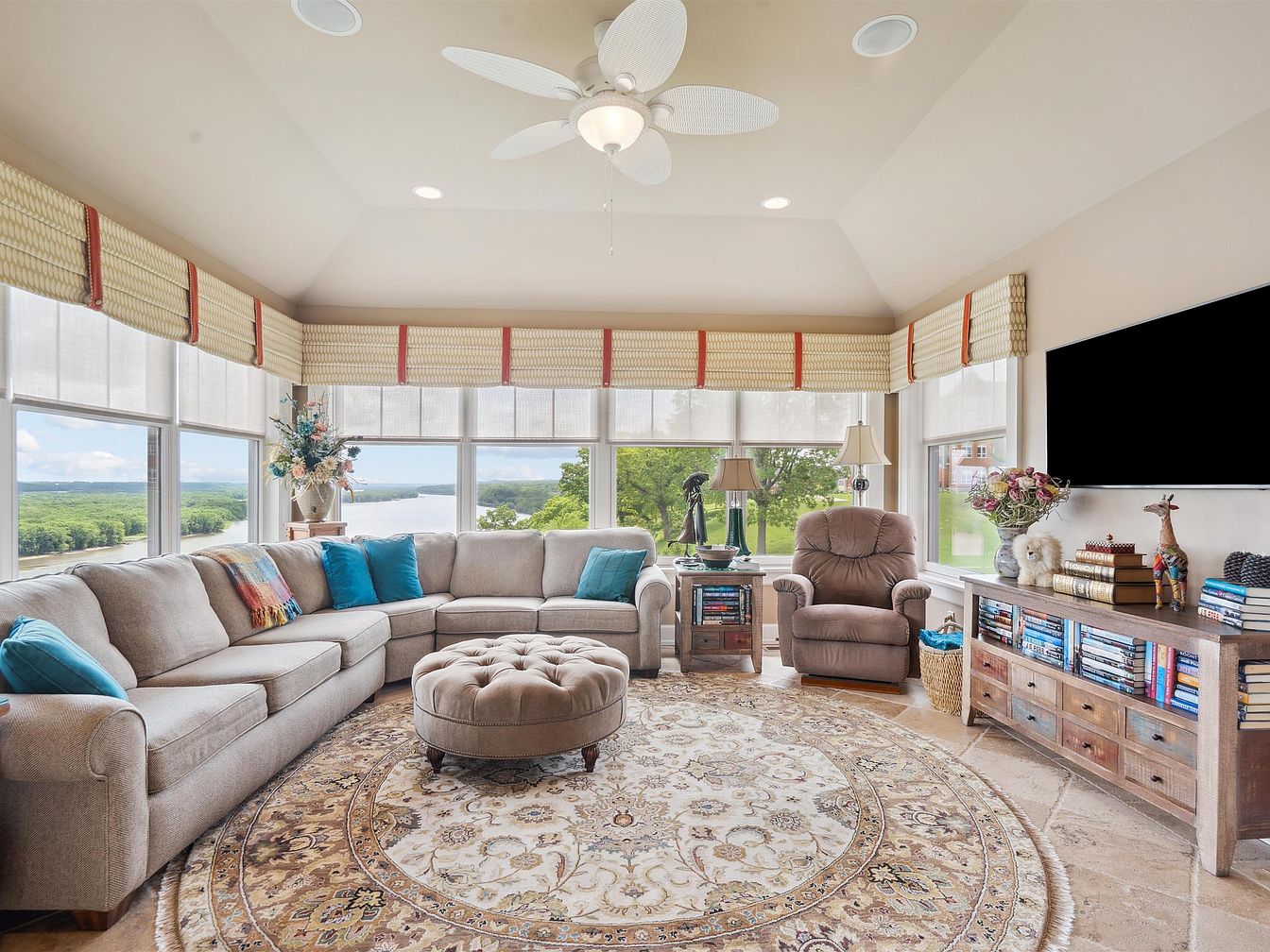 This spacious living room exudes comfort and warmth, featuring a large L-shaped beige sectional adorned with bright turquoise accent pillows and a cozy multicolored throw. A matching tufted round ottoman serves as a central focal point on an ornate circular rug with intricate earth-tone patterns. Floor-to-ceiling windows envelop the space, offering stunning panoramic views of a serene river and lush greenery beyond. The ceiling is vaulted, with a white textured ceiling fan for air circulation. Light-filtering blinds and patterned valances with red accents frame the windows. A plush recliner and a wooden entertainment console filled with books and decorative items add homely charm, complemented by soft, neutral walls and tiled flooring.