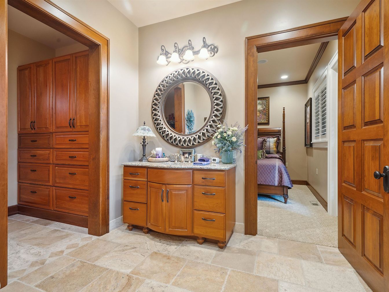 This cozy vanity space features warm wood tones with rich cabinetry and matching trim that frames the area beautifully. The granite countertop hosts a classic sink under a large, intricately designed round mirror, complemented by a three-light fixture above. Decorative elements include a vintage-style lamp and a floral arrangement adding a fresh, elegant touch. Adjacent to this vanity, an open doorway reveals a glimpse of a softly lit bedroom with a wooden bed frame and plush bedding in soothing lavender hues, highlighting the graceful transition between personal grooming and restful retreat spaces. Neutral stone floors unify the layout.
