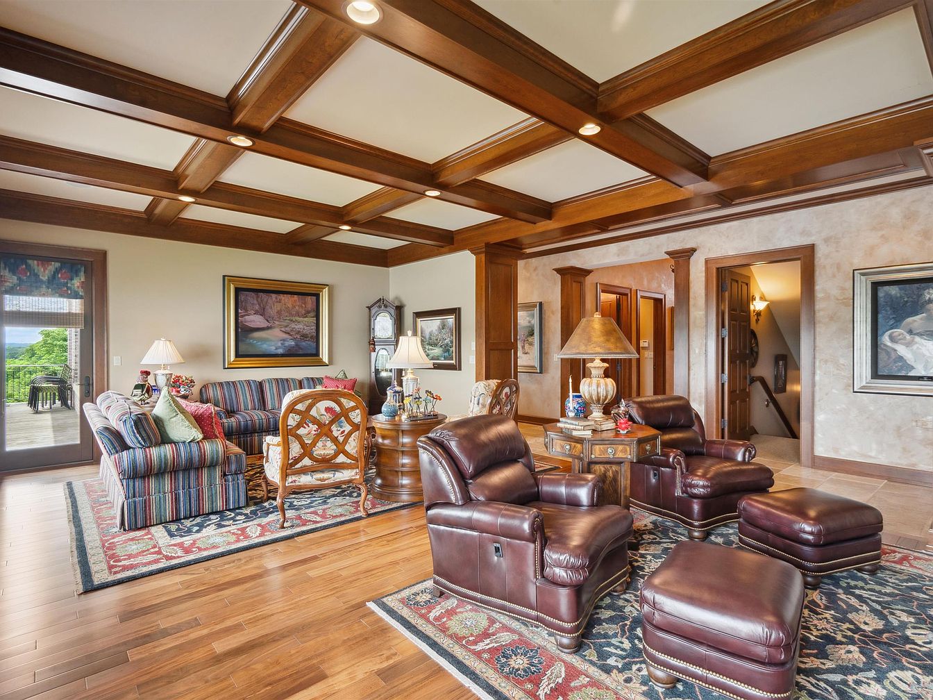 This spacious living area features a luxurious mix of classic and comfortable furnishings. The coffered ceiling with rich wood beams highlights the room’s architectural detail, complementing the warm hardwood floors throughout. Seating includes two plush leather armchairs with matching ottomans positioned on an ornate patterned rug, which pairs harmoniously with a striped fabric sofa and an upholstered chair with carved wood accents on another traditional rug. Soft beige and brown tones dominate the walls and trim, creating a cozy yet refined atmosphere. The room’s layout maximizes an inviting flow toward the balcony, visible through glass French doors.