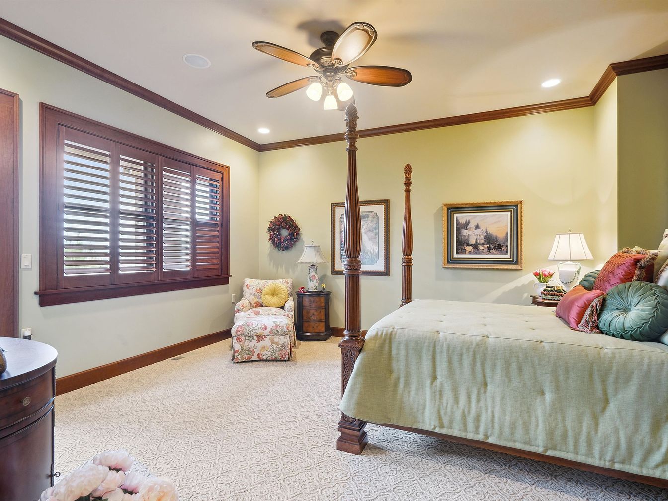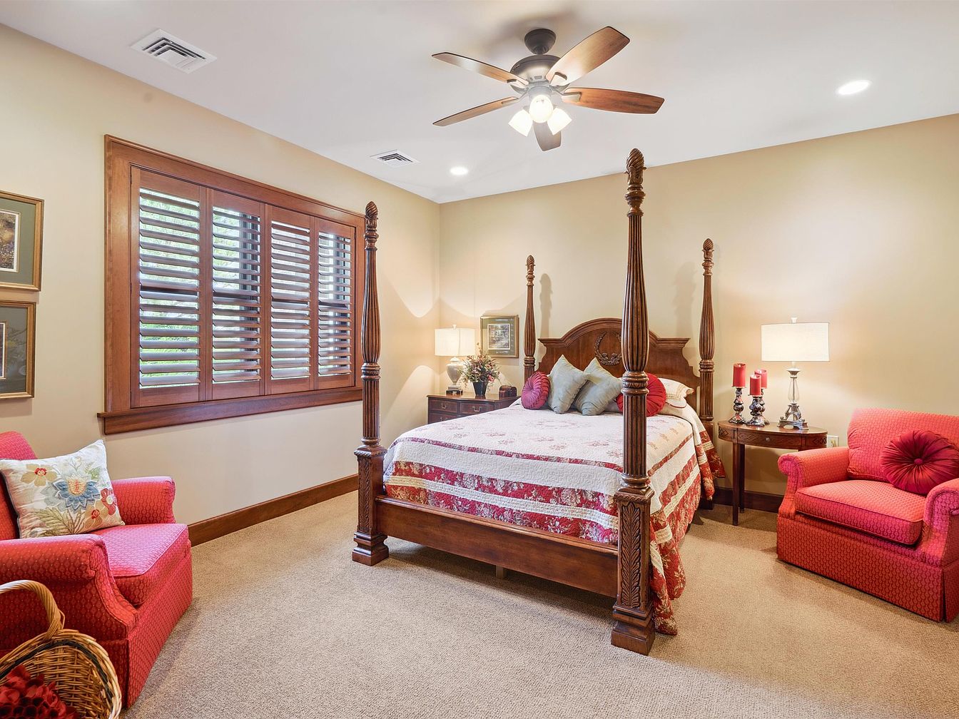 This master bedroom features a spacious and inviting layout with a traditional design aesthetic. The room showcases a four-poster wooden bed with intricately carved posts, adorned with a soft green quilt and an assortment of round and square decorative pillows in shades of green, red, and beige. Walls painted in a light cream tone create a warm ambiance, complemented by dark wood crown molding and matching window trim. Plantation shutters cover the large window, allowing adjustable natural light. A floral armchair with a yellow cushion sits beside a small, curved wooden nightstand with a classic lamp. Artwork with gold frames and a floral wreath add charming decorative touches. The carpet has a subtle patterned design that enhances the cozy atmosphere, while a ceiling fan with wooden blades provides both elegance and functionality.