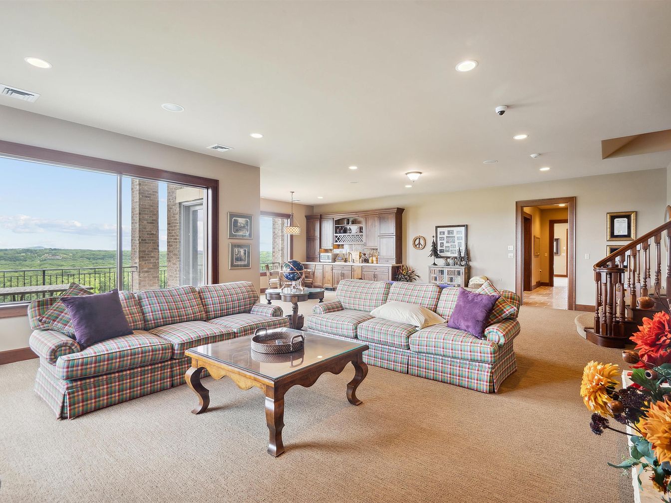 This spacious living area features two large sofas upholstered in a colorful plaid fabric, anchored by deep purple accent pillows for a cozy touch. The neutral beige carpet complements the warm cream walls, creating a soft, inviting ambiance. A glass-top wooden coffee table with gracefully curved legs sits centrally, adding classic elegance. The room’s layout allows clear flow toward a breakfast nook or small dining area near the wood cabinetry with built-in shelving. Large windows and sliding glass doors flood the space with natural light, showcasing panoramic treetop views and connecting indoor and outdoor living beautifully. A staircase with wooden bannisters leads to another part of the home, enhancing the room’s open feel.