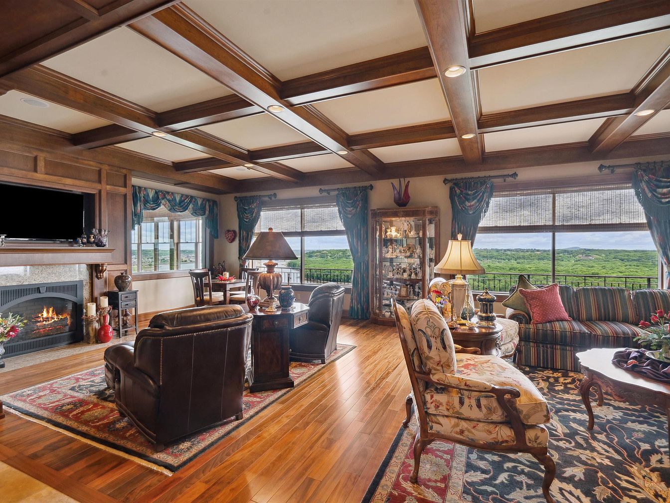This elegant living room features rich wooden coffered ceilings complementing the warm hardwood floors, setting a timeless and cozy ambiance. Comfortable leather armchairs paired with a floral upholstered settee offer varied seating options clustered around wooden tables with classic lamps. Large windows framed by deep green patterned drapes invite impressive natural light while providing stunning panoramic views of lush greenery. A traditional fireplace with a mounted TV above anchors the space, accompanied by vibrant Persian-style area rugs that enrich the room’s warmth and intricate décor. The mix of textures and patterns creates a refined yet inviting environment.