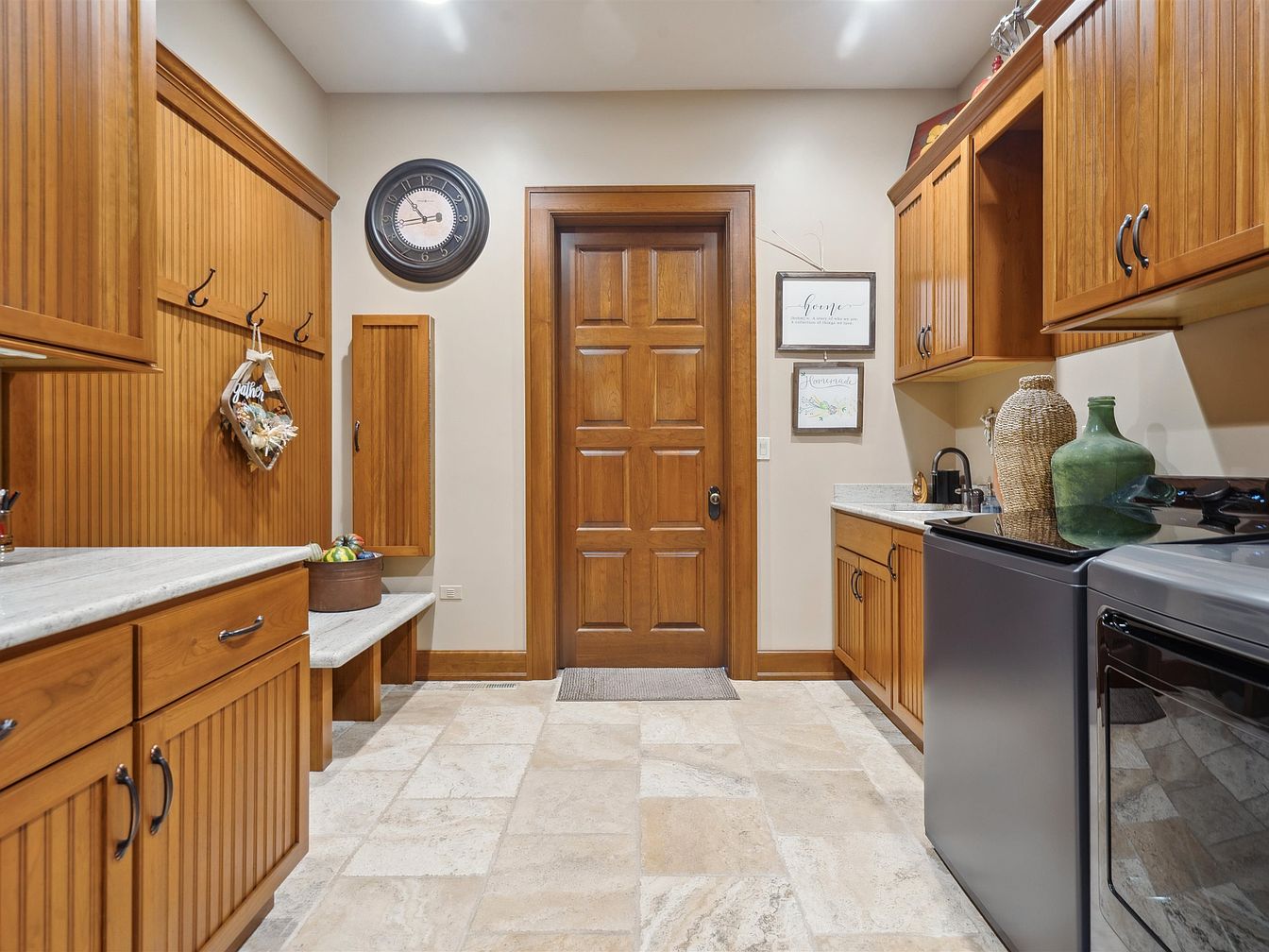 This laundry room features a practical layout with plenty of cabinetry and countertop space. The warm wood tones of the paneled cabinets, door, and trim create a cozy, inviting atmosphere. The beige tile flooring adds a subtle textural element consistent with the neutral wall color. A built-in bench with hooks above offers a convenient spot for coats or bags, enhancing its utility. The stainless steel washer and dryer contrast nicely against the wood. Decorative accents, such as a large round wall clock and framed art, add personality without cluttering the clean, functional design.