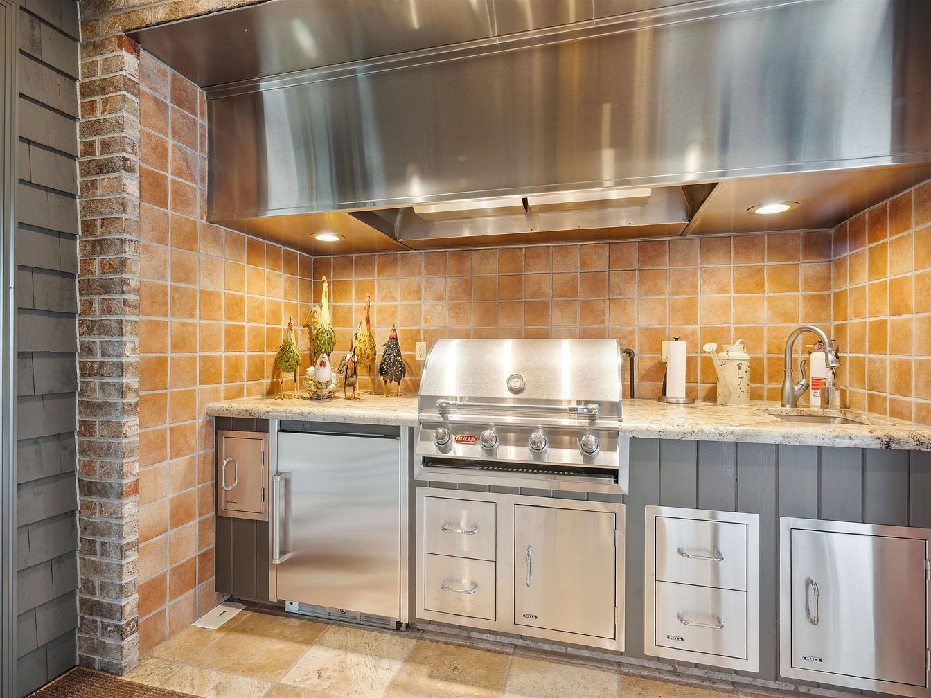 This outdoor kitchen features a built-in stainless steel gas grill with multiple control knobs, flanked by storage cabinets and a small refrigerator beneath a granite countertop. The backsplash is composed of warm-toned square tiles that extend along the entire wall, adding a rustic yet inviting touch. Overhead, a large stainless steel ventilation hood with integrated recessed lighting provides both function and modern style. To the right, a stainless steel sink with a high-arc faucet complements the prep area, while decorative elements including hanging herbs and ceramic chickens add charm and character. The flooring consists of similarly warm stone tiles, enhancing the overall cozy and practical design.