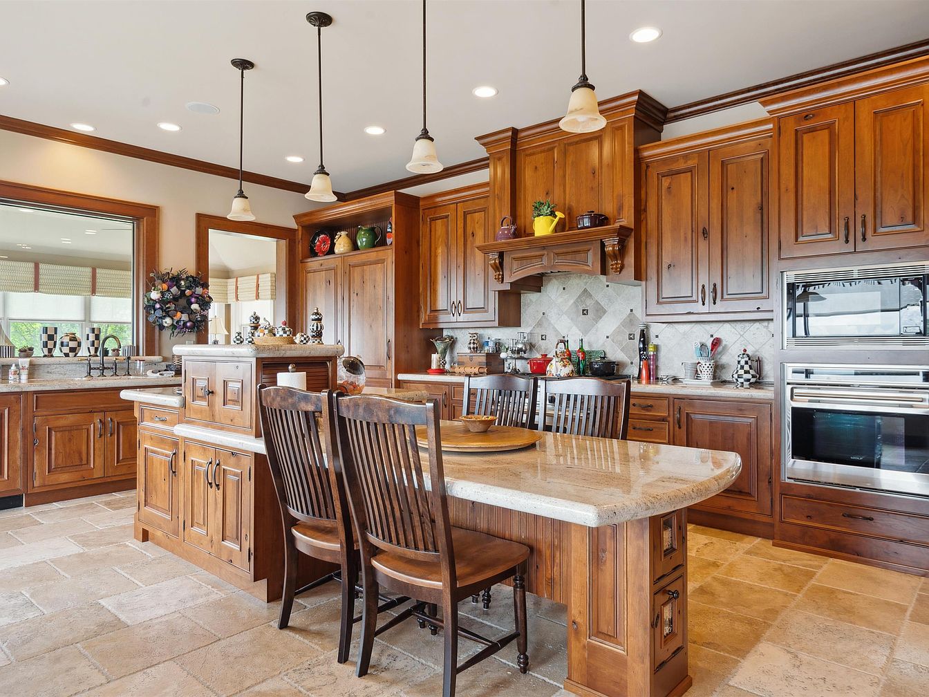 This warm and inviting kitchen features rich wood cabinetry paired with a light beige granite countertop island that extends into a breakfast bar with three sturdy wooden chairs. Pendant lights with gentle amber shades hang above the island, creating a cozy ambiance. The cabinetry showcases intricate paneling and a classic design with crown molding that complements the wood trim around the large windows and doorways. The backsplash incorporates neutral stone tiles with subtle diamond accents, blending seamlessly with the earth-toned floor tiles. Stainless steel appliances add a modern touch to this timeless kitchen space.