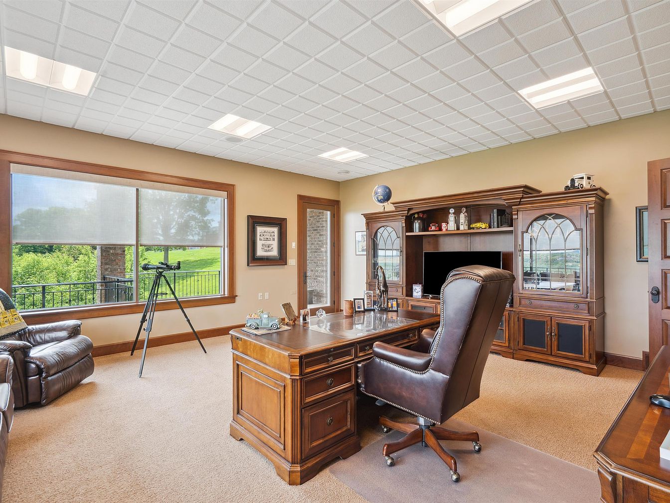 This well-appointed home office features a rich wooden desk with classic detailing and multiple drawers, paired with a high-backed leather swivel chair that emphasizes comfort and professionalism. The large wooden entertainment center along one wall offers ample storage, displaying decorative items and housing a flat-screen TV. A sizable window with roller shades floods the room with natural light, and provides a scenic view of lush greenery outside. The room is carpeted in a neutral tone, complementing the beige walls and warm wood trim. A tripod with a telescope hints at hobbies enjoyed here. Ceiling lights ensure bright and even illumination.