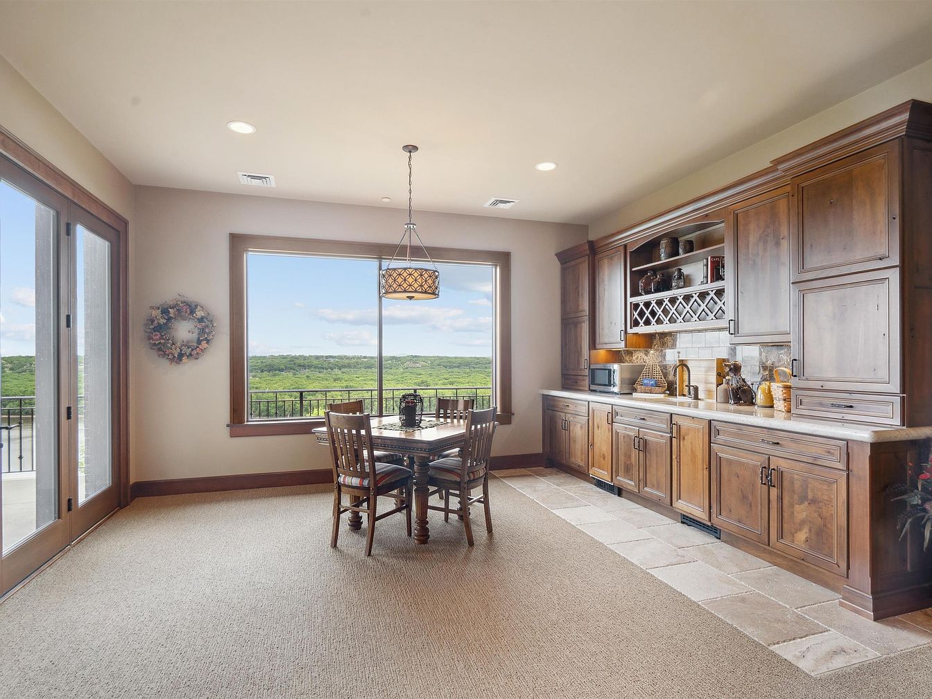 This inviting dining space features a cozy table with four wooden chairs centered beneath an ornate hanging light fixture. Floor-to-ceiling windows and glass doors flood the room with natural light, framing a stunning view of lush greenery outside. The room combines warm wood tones found in the rich cabinetry and trim with neutral beige walls and carpeting, creating a welcoming atmosphere. Expansive built-in cabinets with detailed woodwork stretch along one wall, offering ample storage and display space, including a small wine rack and open shelving accented by soft under-cabinet lighting, perfect for both function and style.