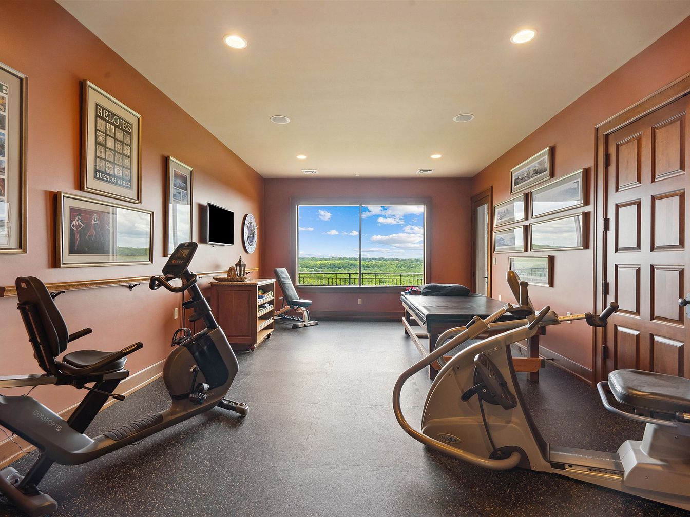 This home gym is thoughtfully designed to maximize both function and aesthetics. Warm, earthy terracotta walls create a cozy ambiance, complementing the natural wood accents seen in the door, trim, and furniture. The flooring is a durable speckled rubber ideal for exercise. Fitness equipment includes a recumbent bike and an elliptical, positioned to enjoy the expansive window view that overlooks lush greenery and a bright sky, filling the space with natural light. Artistic framed pictures line the walls, adding character and a personal touch while reflecting an active, cultured lifestyle. Recessed ceiling lights ensure ample illumination for evening workouts.