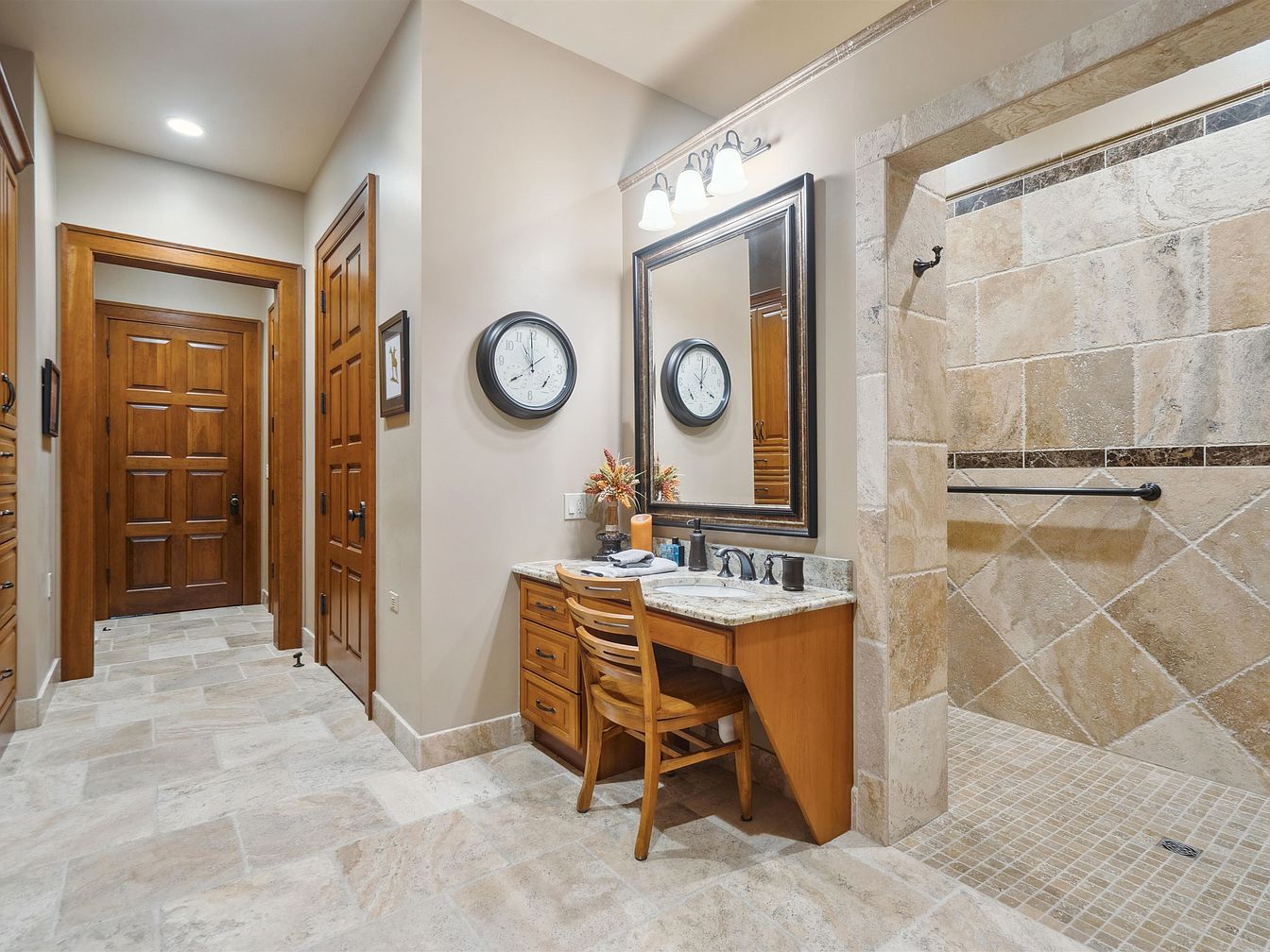 This bathroom features a warm, inviting design with natural stone tile flooring that smoothly transitions into a walk-in shower lined with matching textured tiles in earth tones, accented by a dark border tile strip. The vanity area includes a medium-toned wooden countertop with a granite surface and built-in sink, paired with a classic dark-framed mirror above. A wooden chair tucks neatly under the vanity, complementing the warm wood cabinetry and doors. Soft beige walls and recessed lighting create a serene atmosphere, while the round clock and subtle floral arrangement add thoughtful, homely touches.