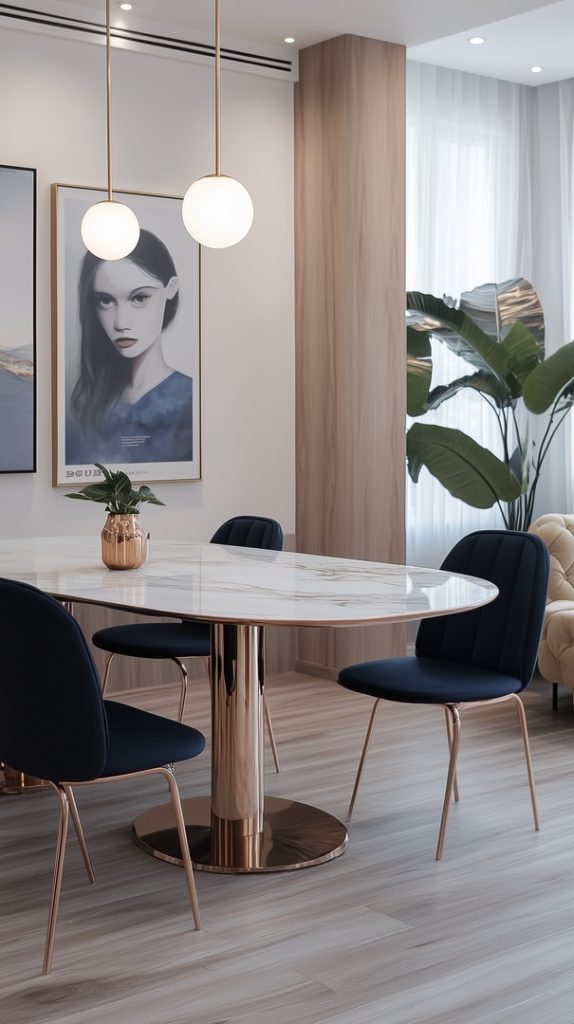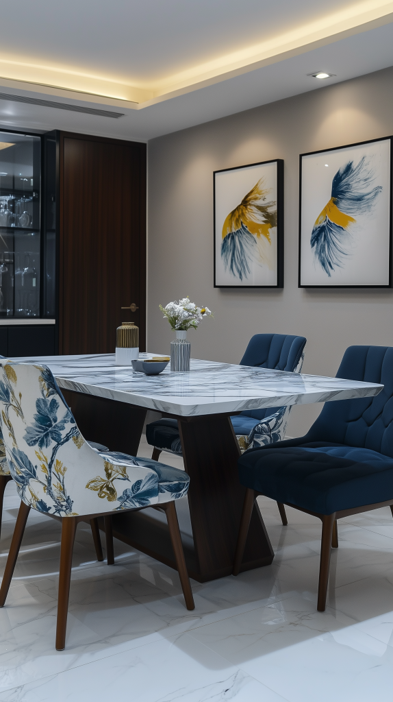 A modern dining room featuring a sleek marble table paired with navy blue and floral-patterned chairs. The setting is illuminated by soft, recessed lighting, and minimalist artwork on the wall adds an elegant touch.