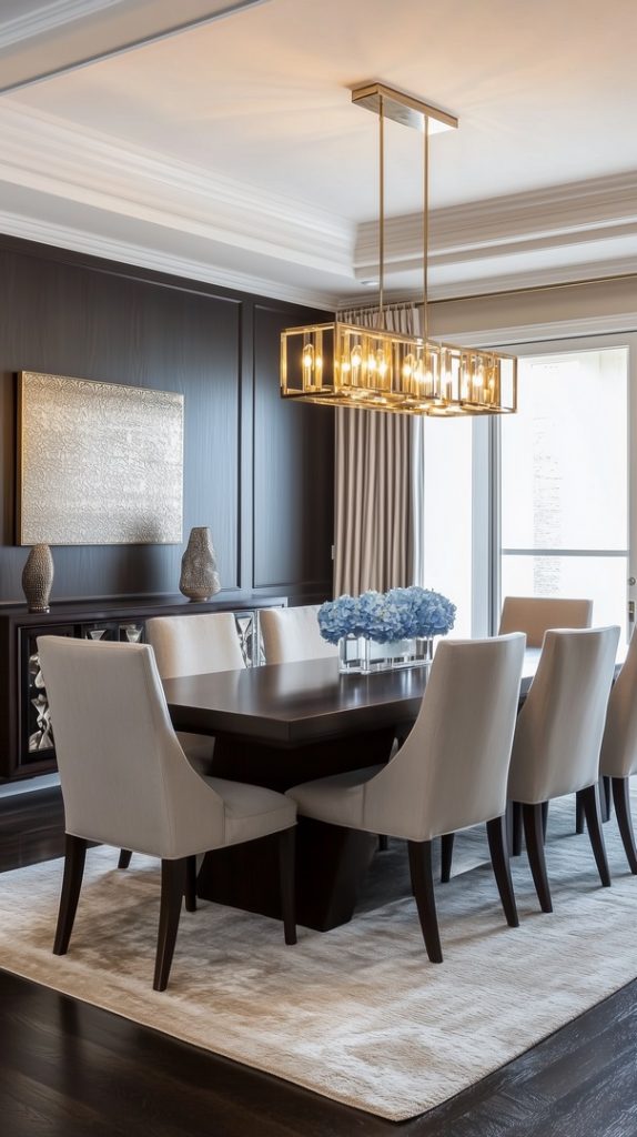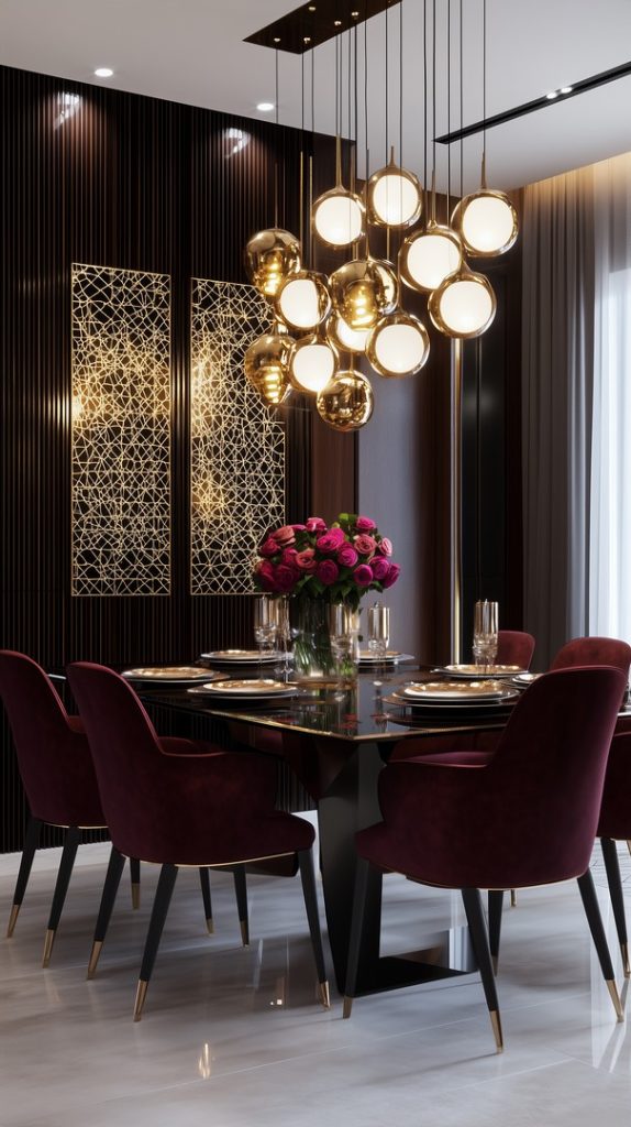 This elegant dining room exudes luxury with its dark color palette and chic velvet chairs. The golden, clustered pendant light serves as a focal point, enhancing the glamorous ambiance. The deep-toned walls and large windows balance the light and dark elements, making this space feel sophisticated yet cozy.