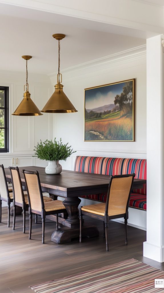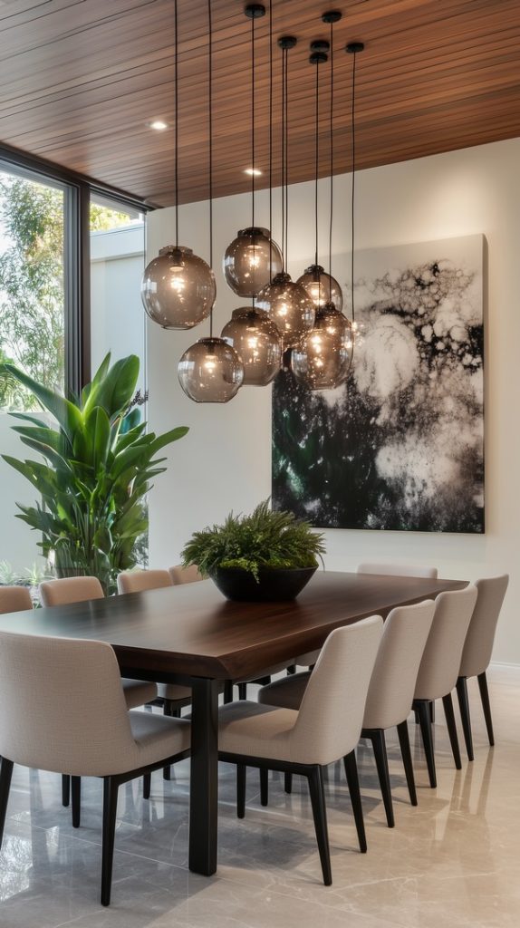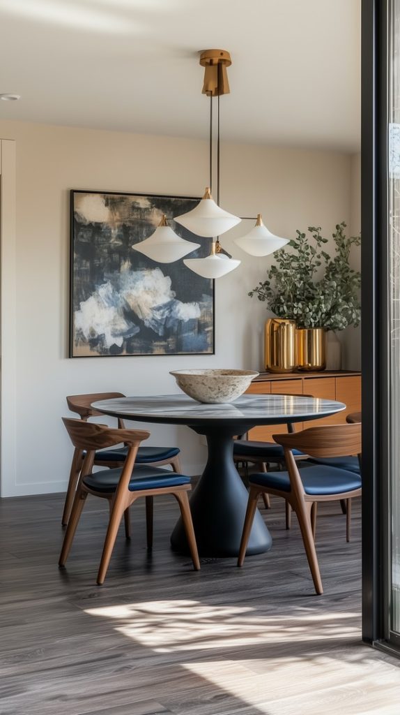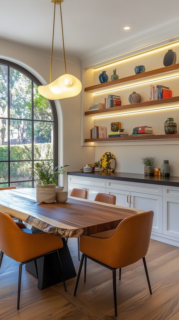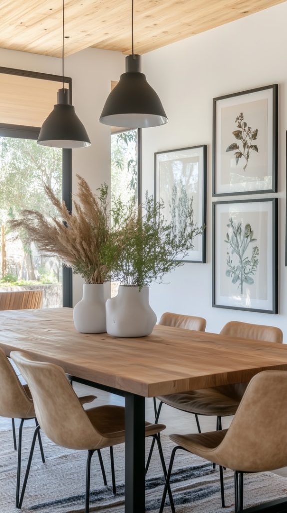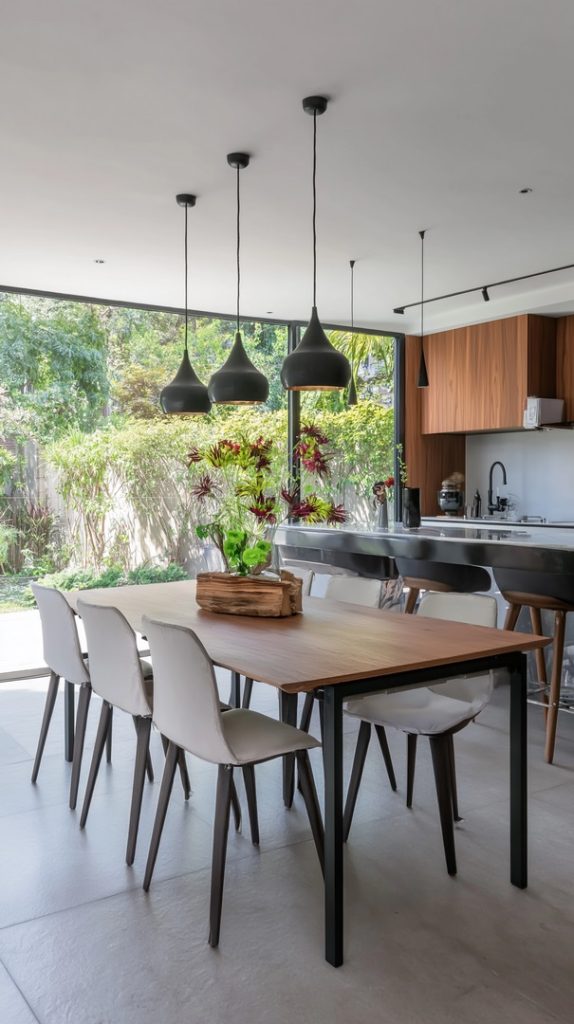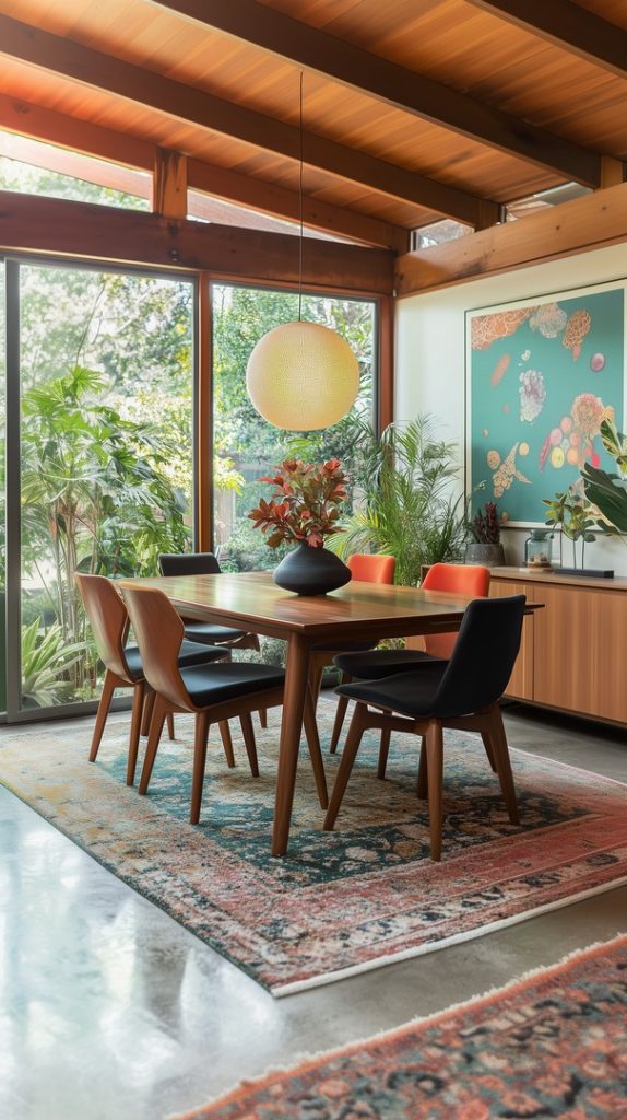 This dining area is a nod to mid-century modern design, with its clean lines and retro-inspired furniture. The wooden table and mismatched chairs add character, while the geometric lighting fixture gives the space a contemporary twist, making it perfect for both casual and formal dining.