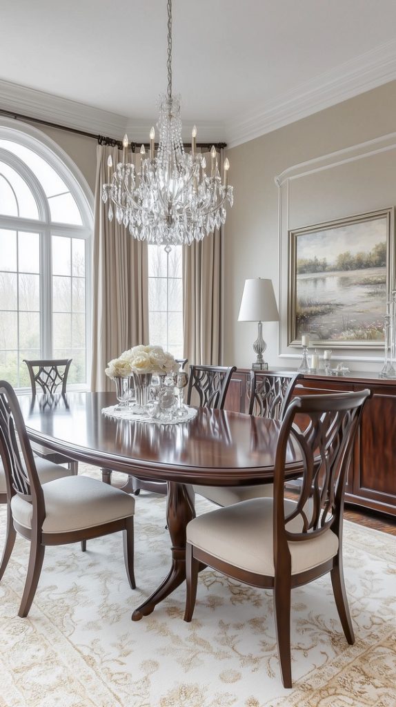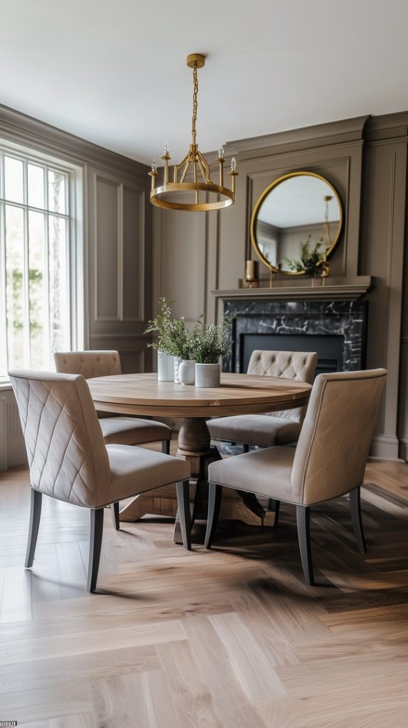 A sophisticated dining room that fuses traditional design elements with modern touches. The elegant dining table and upholstered chairs are classic, but the contemporary chandelier and light tones add freshness. The large wall mirror with a gold frame enhances the space, making it feel larger while reflecting natural light. This room is ideal for those who appreciate timeless elegance with a modern twist.