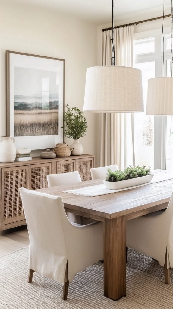 This dining room emphasizes a connection to nature with large windows, light wood furniture, and neutral tones. The soft lighting fixtures and natural materials create a calm, inviting space, perfect for dining in a serene atmosphere.