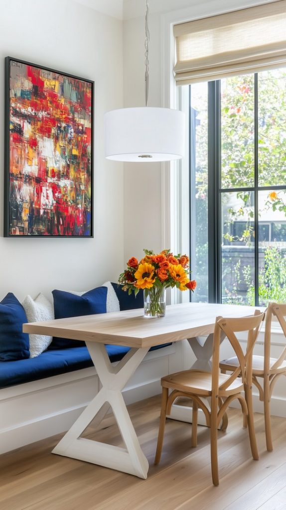 The natural light flooding into this bright dining space creates a fresh, airy feel. The soft color palette, cozy seating, and eclectic wall art make it both stylish and comfortable, ideal for family gatherings or casual dinners with friends.