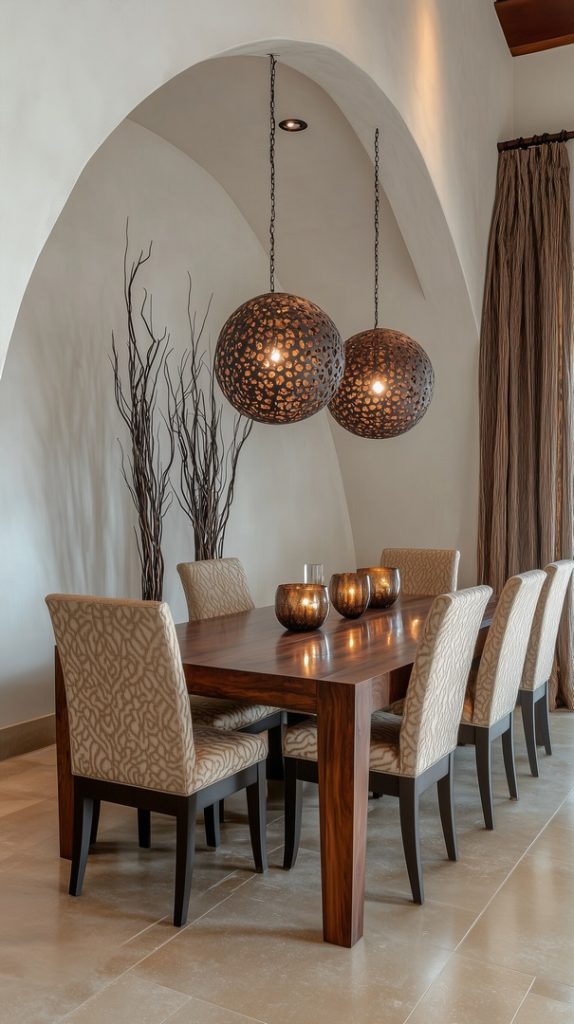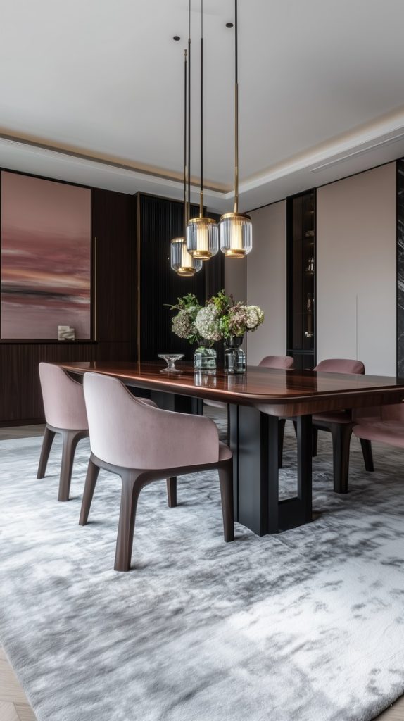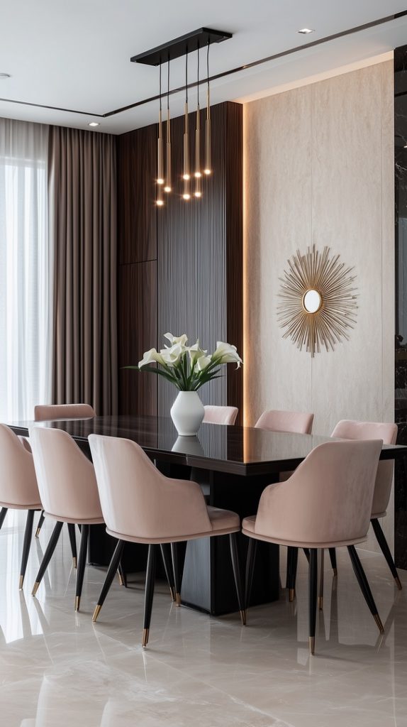 This dining room’s rich textures create a luxurious feel, from the plush chairs to the unique chandelier. The large dining table provides a modern yet elegant centerpiece, while soft, neutral tones add to the overall serene atmosphere.