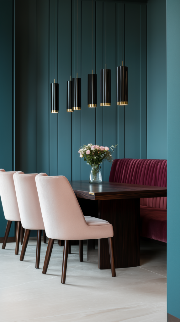 A sophisticated dining area with a dark wood table and plush burgundy seating. The teal walls create a striking contrast with the black and gold hanging pendant lights, while a vase of fresh flowers adds a natural accent to the space.
