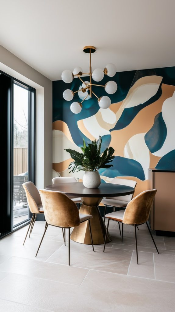 A bold, artistic dining space that combines modern furniture with an eye-catching mural. The curvaceous shapes and playful color palette on the wall create an art-gallery vibe. The round table, surrounded by sleek upholstered chairs, is grounded by subtle, neutral floor tiles, allowing the mural to be the star. This dining room is perfect for those who want to make a statement while keeping the furniture design minimalist and functional.