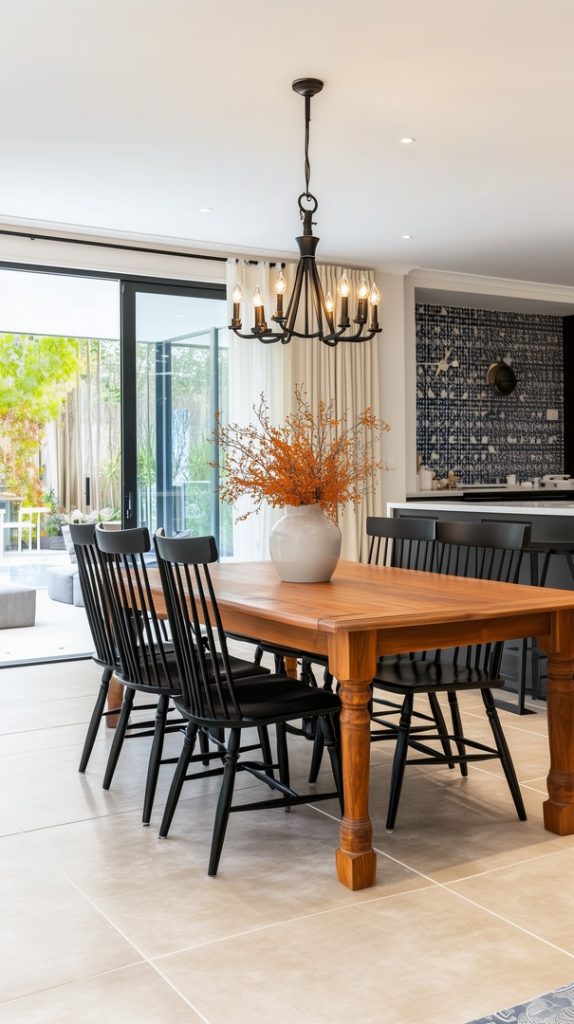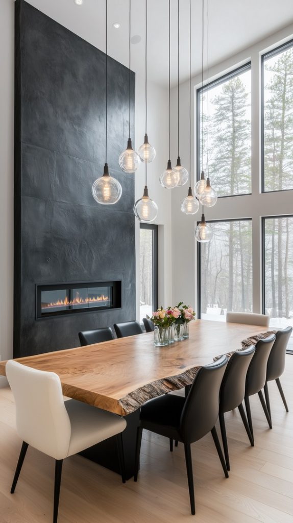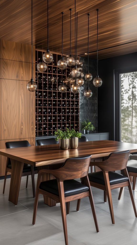 This dining room blends industrial chic with modern elegance, featuring sleek black chairs and wooden accents. The pendant lighting with exposed bulbs and minimalist decor give it a cool, edgy vibe, while the light wood table softens the look for a balanced atmosphere.