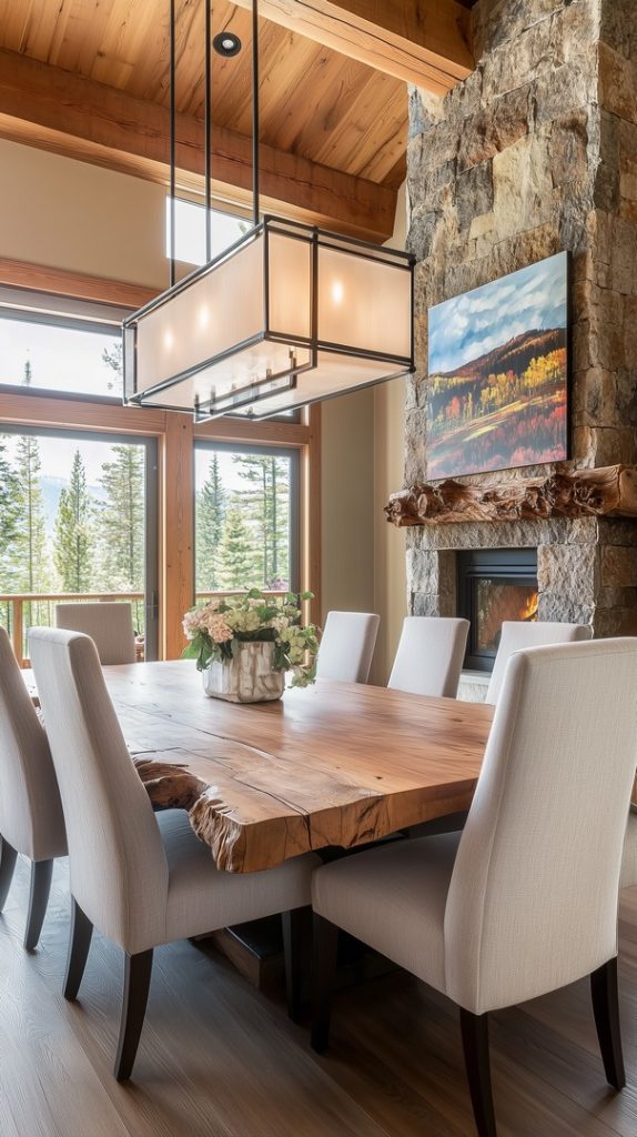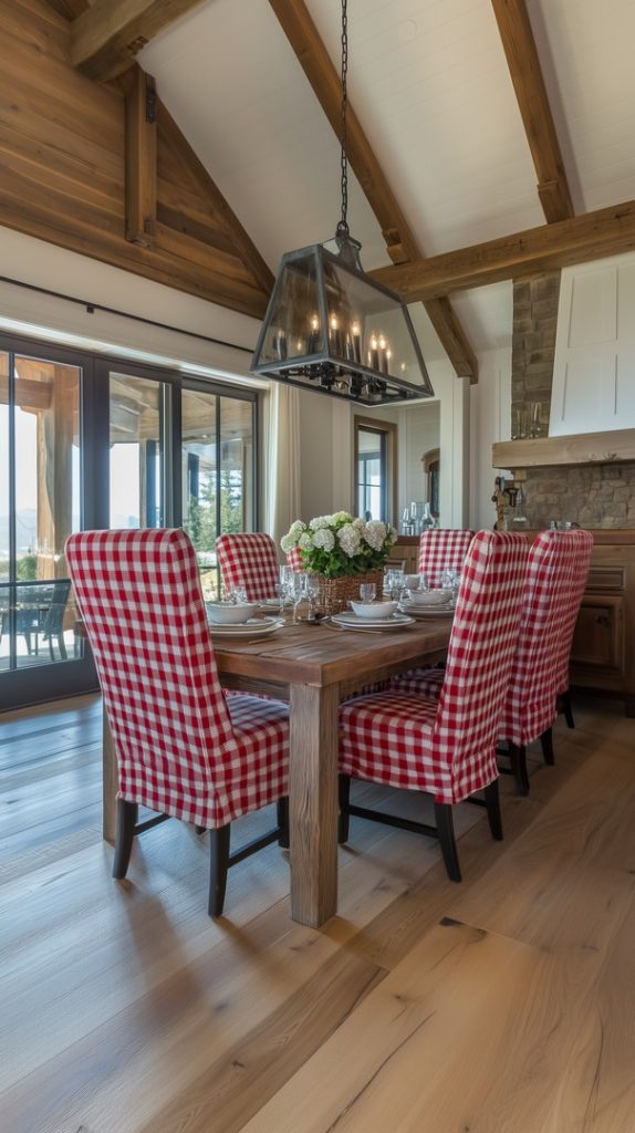 With its wooden beams and warm, earthy tones, this dining room exudes rustic charm. The plaid chairs add a cozy, traditional touch, while the large windows allow natural light to flood in, making the space feel both inviting and airy.