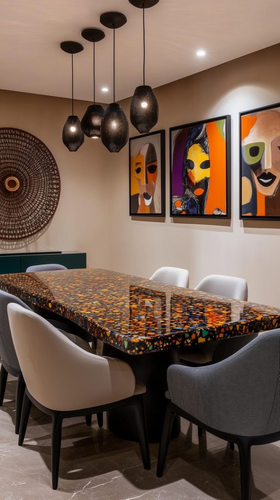 This dining space showcases an eclectic blend of colors, patterns, and textures. From the patterned chairs to the bold artwork, the room feels dynamic and creative, making it perfect for those who enjoy artistic, statement-making design.