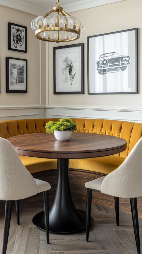 A cozy and stylish dining room with a round wooden table, mustard-colored bench seating, and sleek white chairs. The gold chandelier adds a luxurious feel, while the monochromatic artwork on the walls keeps the design modern and chic.