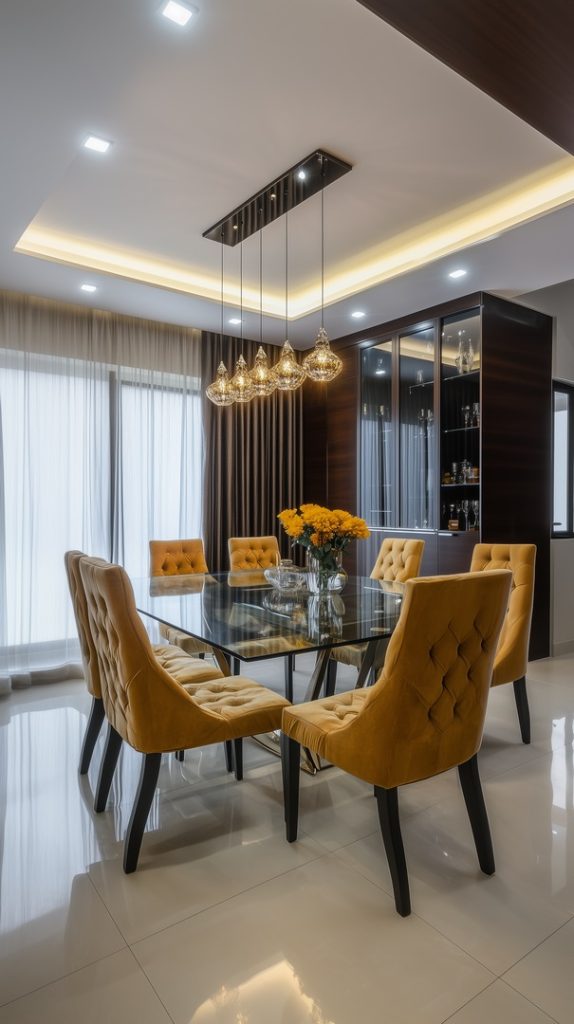 With its combination of marble surfaces, glass accents, and plush seating, this dining room embodies modern luxury. The lighting fixture is both elegant and contemporary, illuminating the space with a warm glow. The rich textures and clean lines make it a sophisticated space for dining.