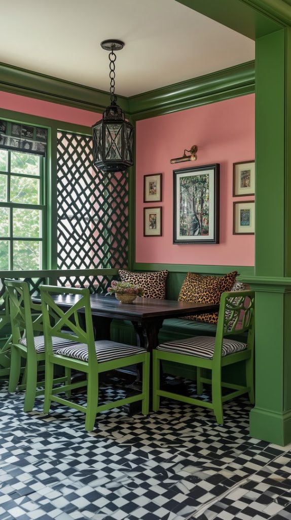 This vibrant, eclectic dining room stands out with its bold color-block design. With a mix of green and pink wall accents and latticework, this room plays with texture and color in a daring way. The casual wooden dining set blends with the colorful and patterned tile floors, creating a dynamic and artistic environment. It’s a space that feels fun and energetic, perfect for those who enjoy bright, whimsical interiors.