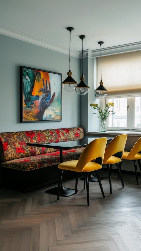 This retro-inspired dining room brings a fun twist to modern design with its vibrant yellow chairs and floral banquette. The abstract wall art and industrial-style pendant lights add to the playful atmosphere, while the wood herringbone flooring gives it a modern edge. It’s the perfect blend of color, texture, and pattern, ideal for those who want a cheerful, lively dining space that nods to the mid-century modern era.
